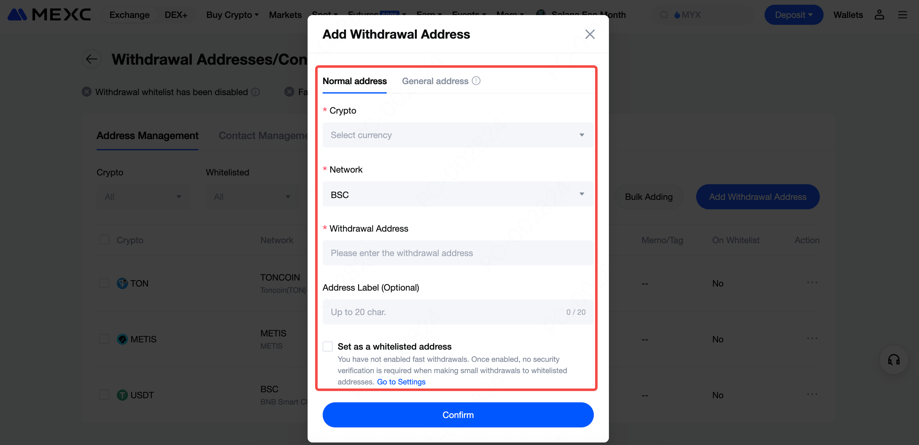 5) Isikan kripto, alamat, detail jaringan, dll. Kemudian, centang kotak di samping "Tambah ke Whitelist", lalu ketuk Konfirmasi untuk menyelesaikan.