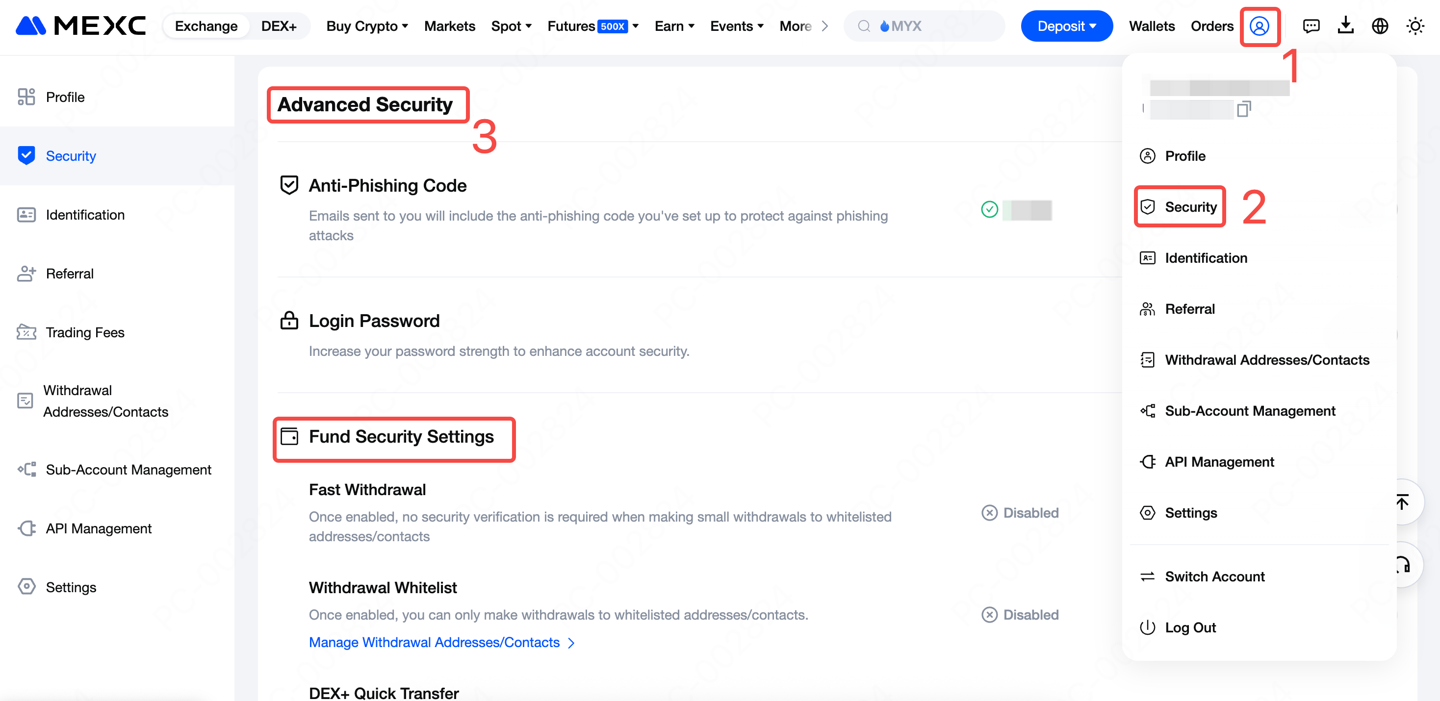 Masuk ke MEXC, arahkan kursor ke ikon pengguna di sudut kanan atas beranda, lalu pilih Keamanan. Gulir ke bawah ke "Keamanan Lanjutan", lalu di bawahnya Anda akan menemukan "Pengaturan Keamanan Dana".