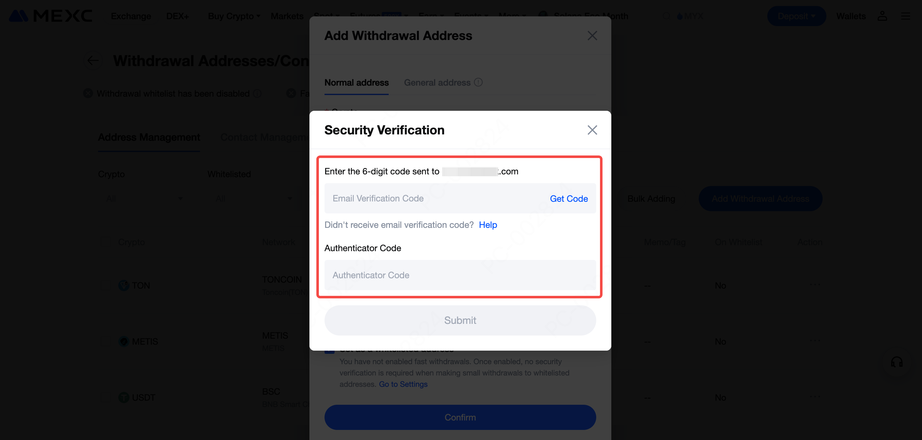 Isikan informasi verifikasi keamanan, lalu klik Konfirmasi untuk menyelesaikan penambahan alamat penarikan. Demikian pula, verifikasi akan didasarkan pada pengaturan autentikasi dua faktor (2FA) yang telah Anda konfigurasikan secara pribadi.