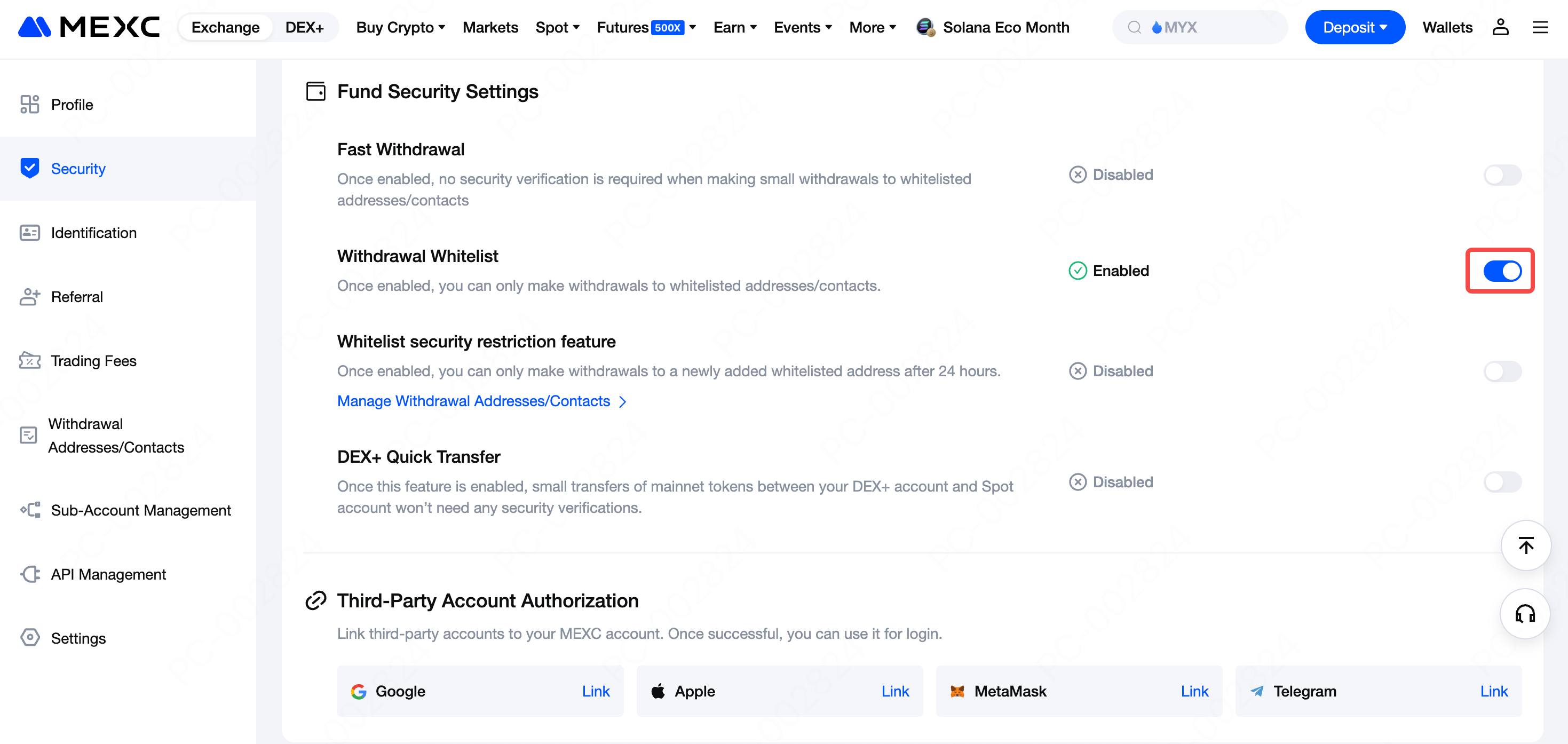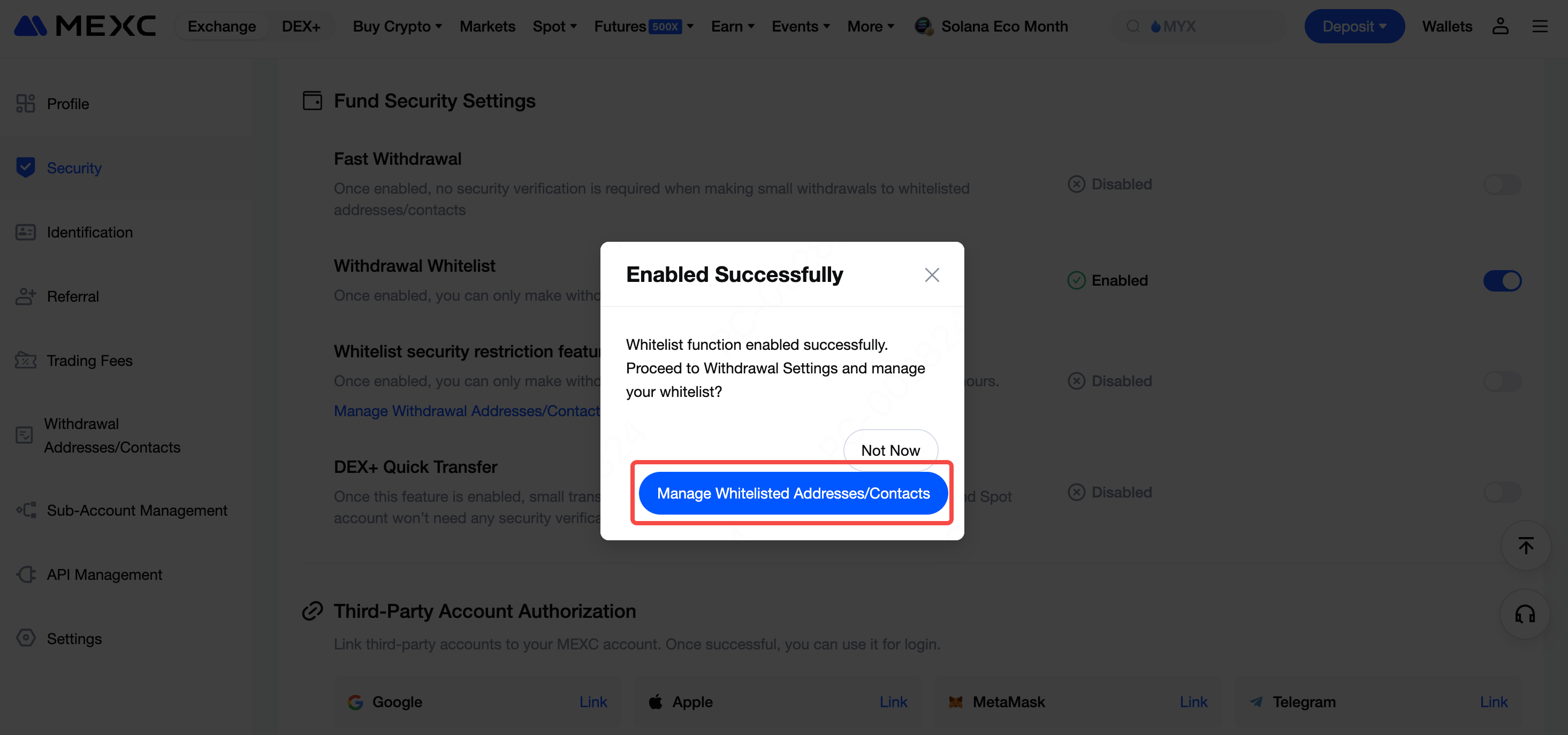 Klik tombol pengalih di sisi kanan Whitelist Penarikan, lalu selesaikan verifikasi keamanan untuk mengaktifkan fitur tersebut.