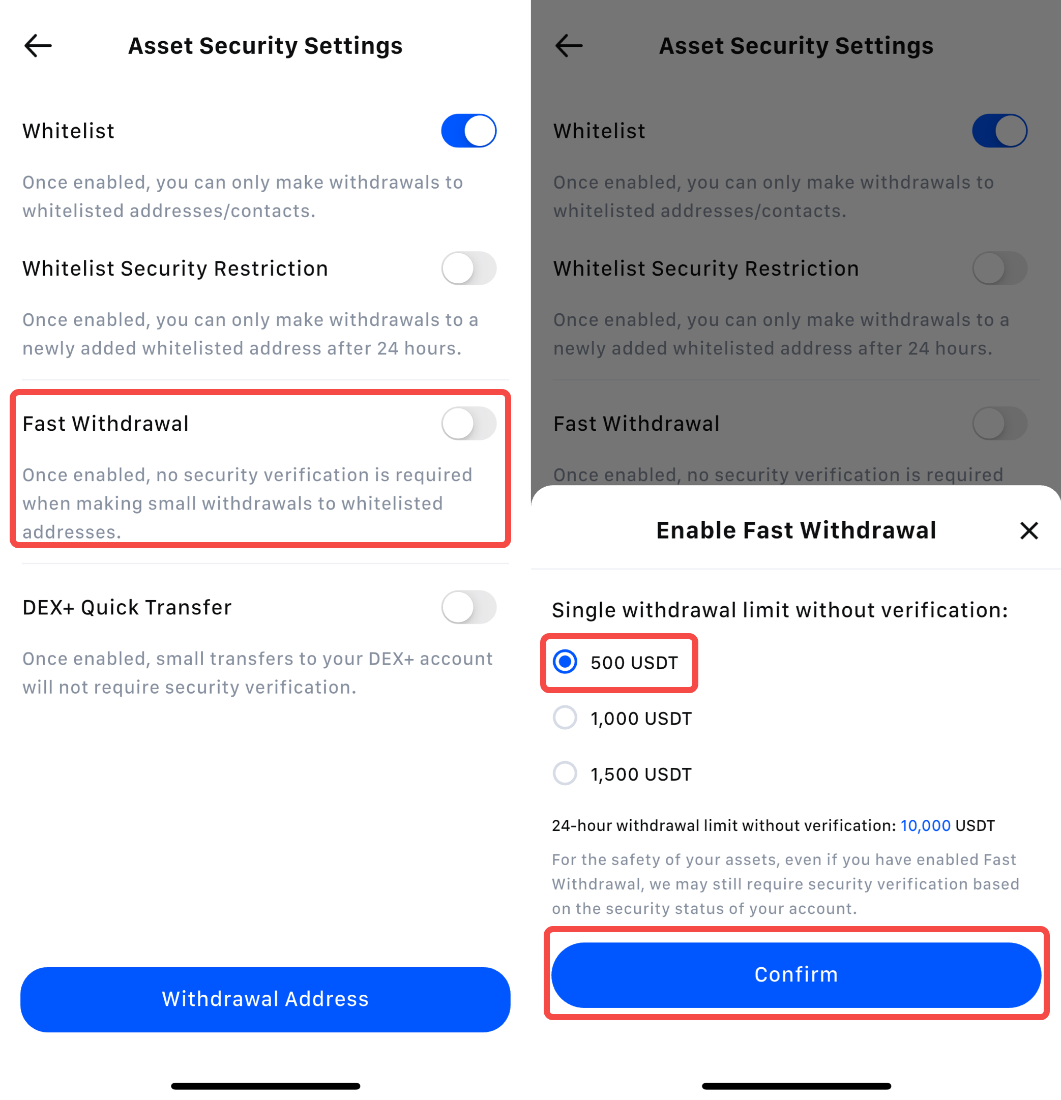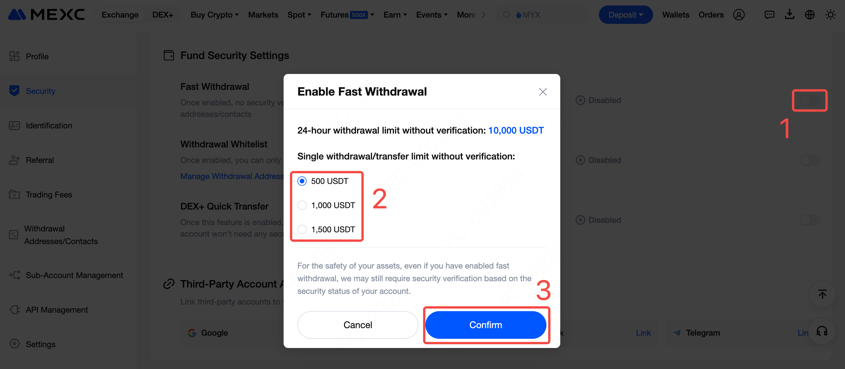 Klik tombol pengalih di sisi kanan "Penarikan Cepat", lalu pilih limit jumlah penarikan/transfer tunggal tanpa verifikasi. Di sini, kita akan menggunakan 500 USDT sebagai contoh. Klik Konfirmasi.