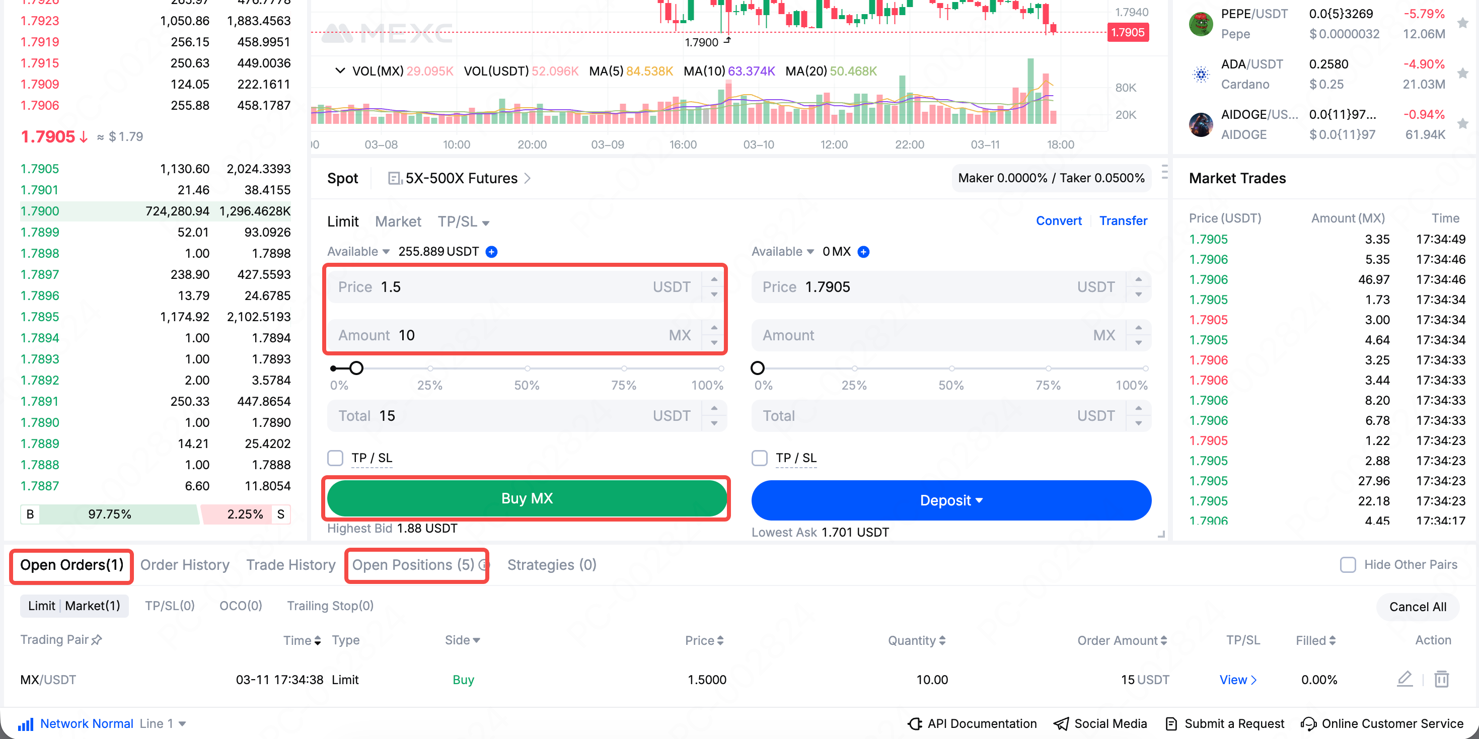Berikut ini menggunakan pasangan perdagangan MX/USDT sebagai contoh untuk menunjukkan langkah spesifik dalam menempatkan limit order.