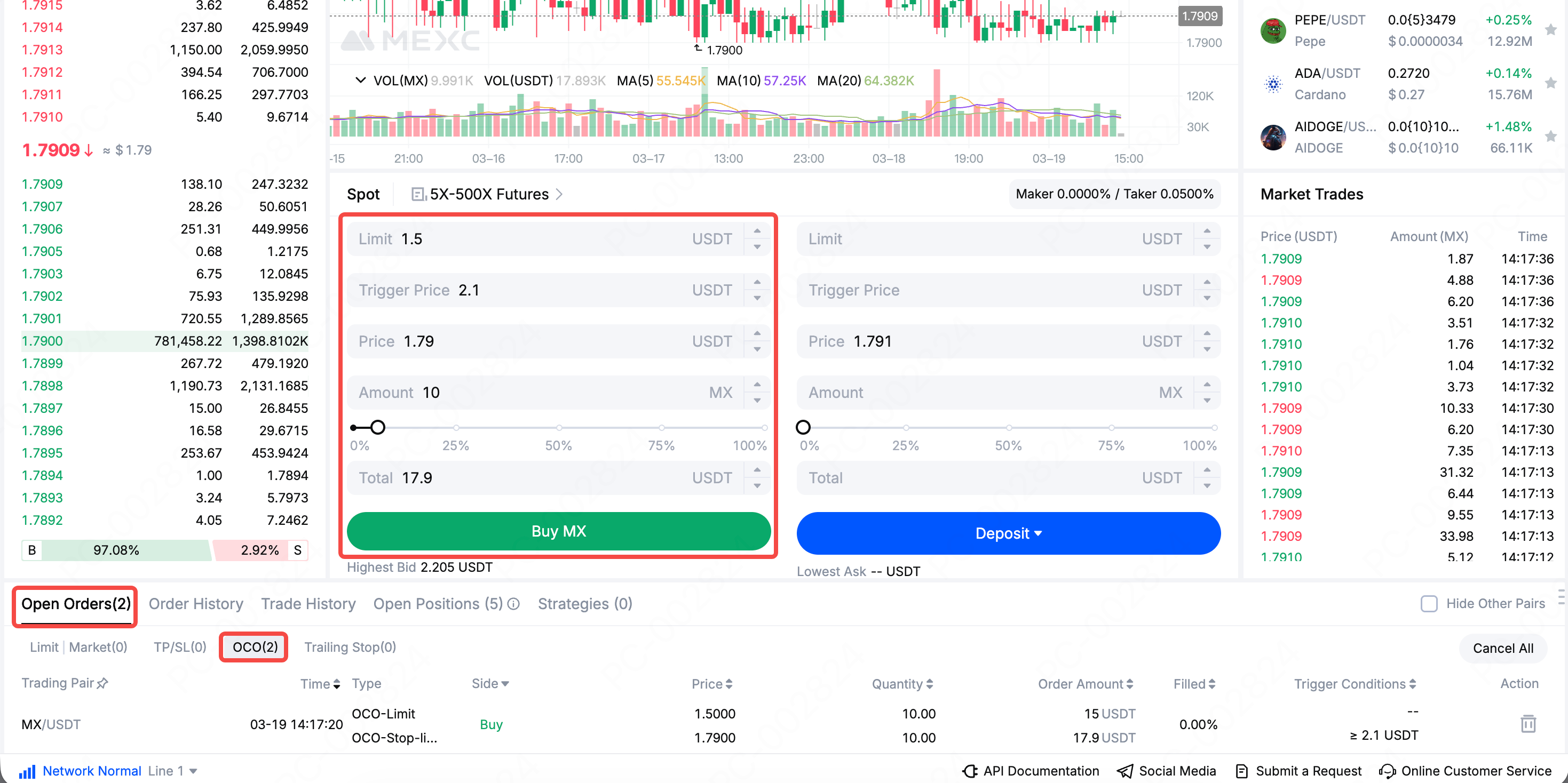 Buka dan masuk ke Aplikasi MEXC → Perdagangan → pilih pasangan perdagangan MX/USDT → OCO → masukkan Limit, Harga Pemicu, Harga, dan Kuantitas → Beli MX