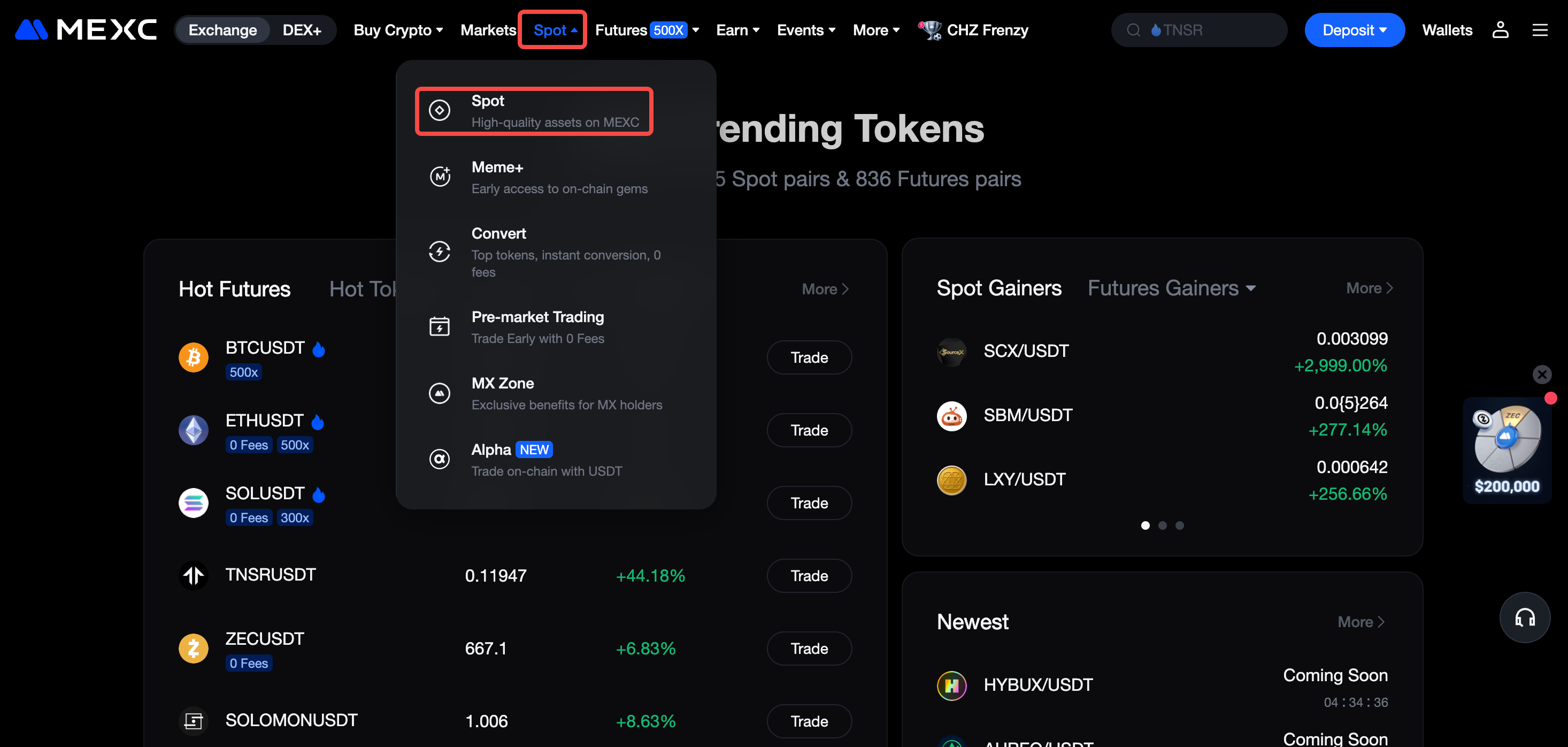 Kunjungi situs web resmi MEXC, lalu masuk ke akun Anda. Pada bilah navigasi atas, arahkan kursor ke Spot lalu klik Spot.