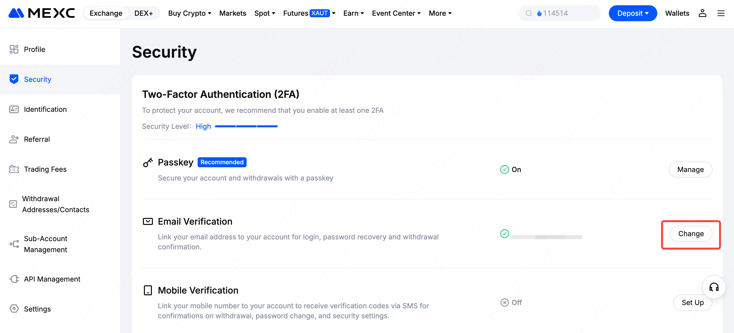 Buka situs web resmi MEXC, lalu masuk. Dari bilah navigasi atas, klik ikon profil Anda, lalu buka Keamanan. Di halaman Keamanan, Anda dapat melihat alamat email yang telah berhasil ditautkan dan diverifikasi. Pastikan alamat email tertaut adalah yang Anda gunakan untuk menerima kode verifikasi. Jika tidak sesuai, klik Ubah di sisi kanan untuk menautkan alamat email lain.