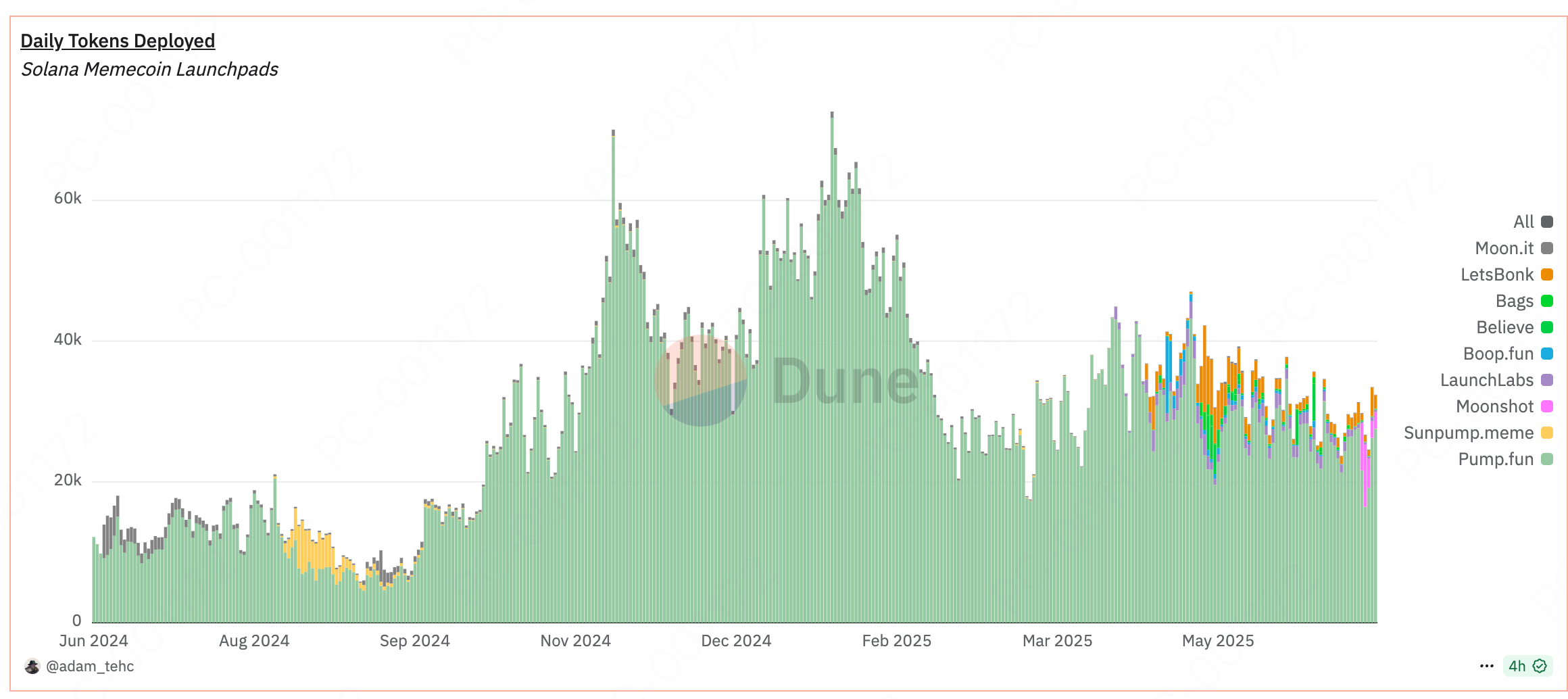 Inoltre, il numero di memecoin di nuova emissione ha continuato a crescere nella prima metà del 2025. Tra queste, Solana è emersa come “incubatrice di memecoin”, con 15,000-20,000 nuovi token lanciati ogni giorno. Le sue commissioni di transazione basse e i tempi di conferma ultra rapidi hanno permesso all'intero ciclo “lancio del token - hype - incasso” di svolgersi in pochi minuti. Un esempio è il token a tema animale POPCAT, che ha sfruttato il fascino virale di un “gioco di clic con i gatti” per raggiungere una capitalizzazione di mercato di 1.2 miliardi di dollari in 72 ore.