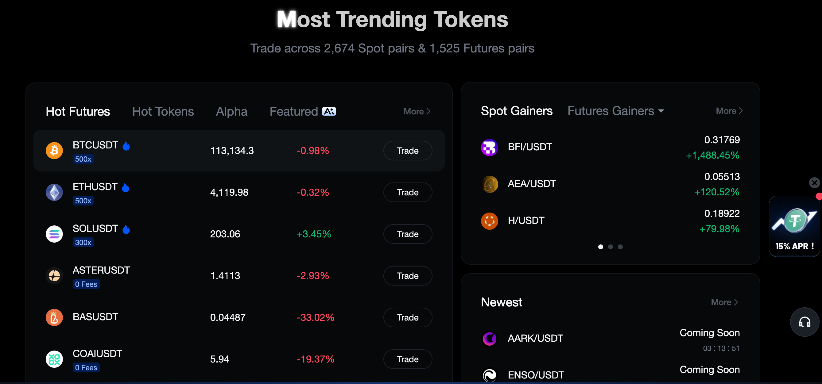 Al 14 ottobre 2025, MEXC ha listato oltre 2,674 coppie Spot e 1,525 coppie Futures, coprendo tutto: dai token principali a quelli di tendenza, una varietà che supera di gran lunga la media del settore. Questa copertura completa deriva dall’ecosistema unico di MEXC, alimentato dal sistema di aggregazione decentralizzato MEXC DEX+ e da MEXC Alpha, che individuano rapidamente nuovi progetti di alta qualità, riducono i tempi decisionali di listing e consentono risposte di mercato più agili. Il risultato è che sia i trader principianti che quelli esperti possono trovare su MEXC obiettivi di investimento adatti, diversificare i portafogli, ridurre i rischi e ottimizzare l’allocazione degli asset.