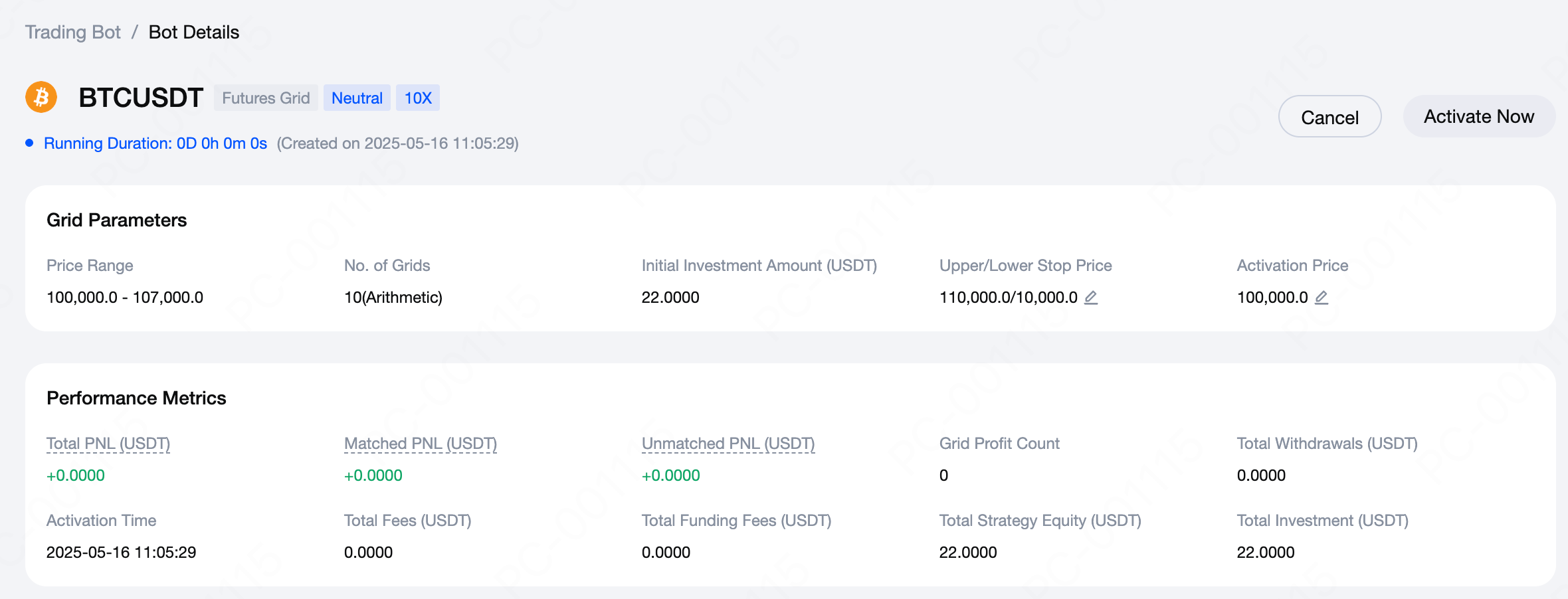 Se il prezzo di attivazione è impostato nelle Impostazioni avanzate durante la creazione del bot, il bot non si attiverà immediatamente dopo la creazione. Si attiverà solo quando l'ultimo prezzo di mercato dell'asset selezionato raggiungerà il prezzo di attivazione specificato.