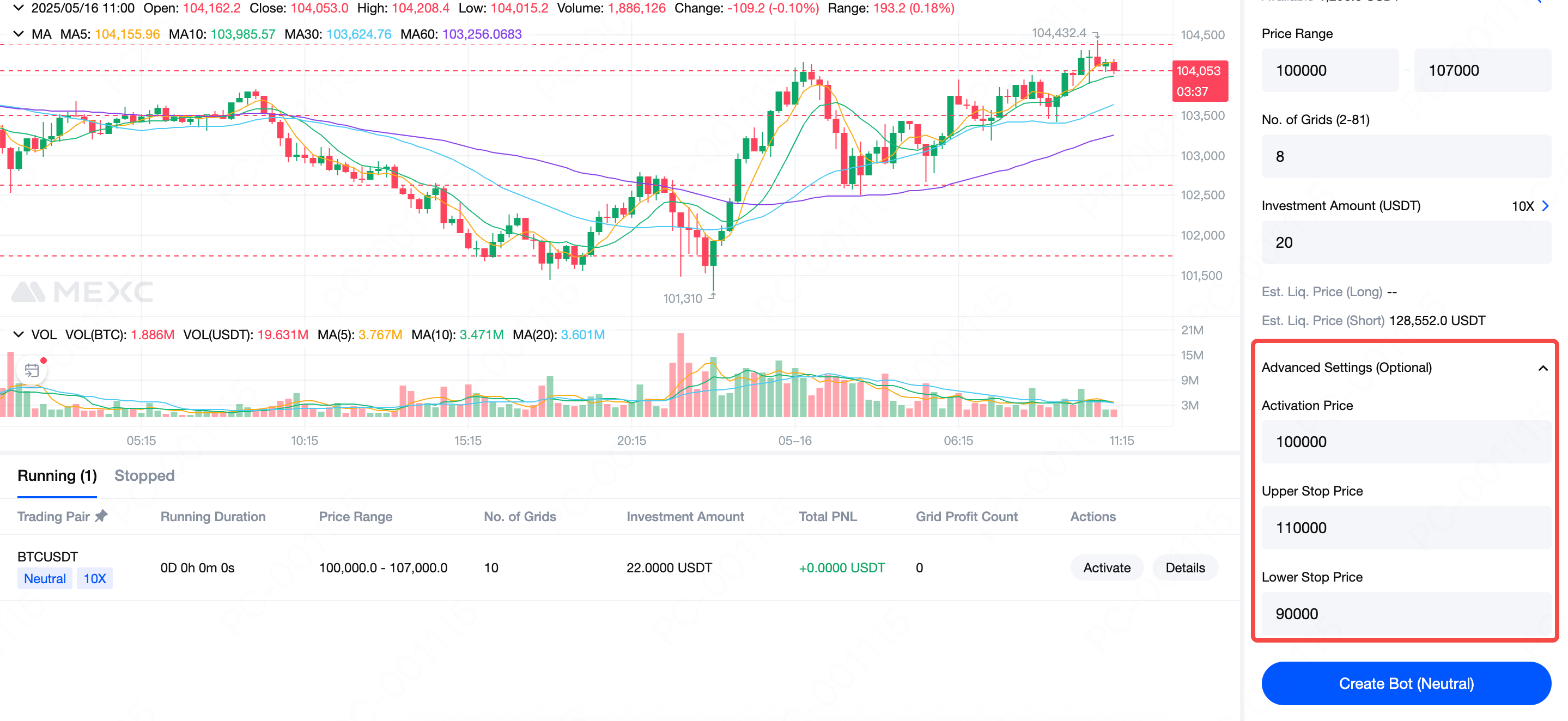 Prezzo di attivazione: il bot grid trading si avvierà solo quando il prezzo di mercato raggiungerà il prezzo di attivazione specificato. Se non impostato, il bot si avvierà immediatamente dopo la creazione. Il prezzo di attivazione deve rientrare nell'intervallo di prezzo definito.