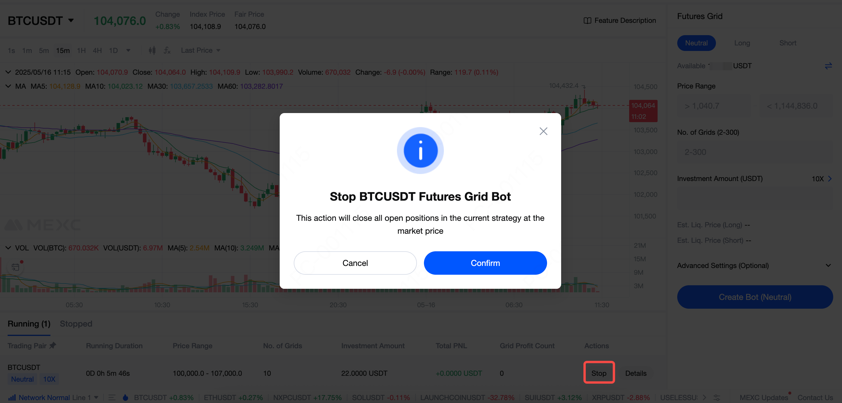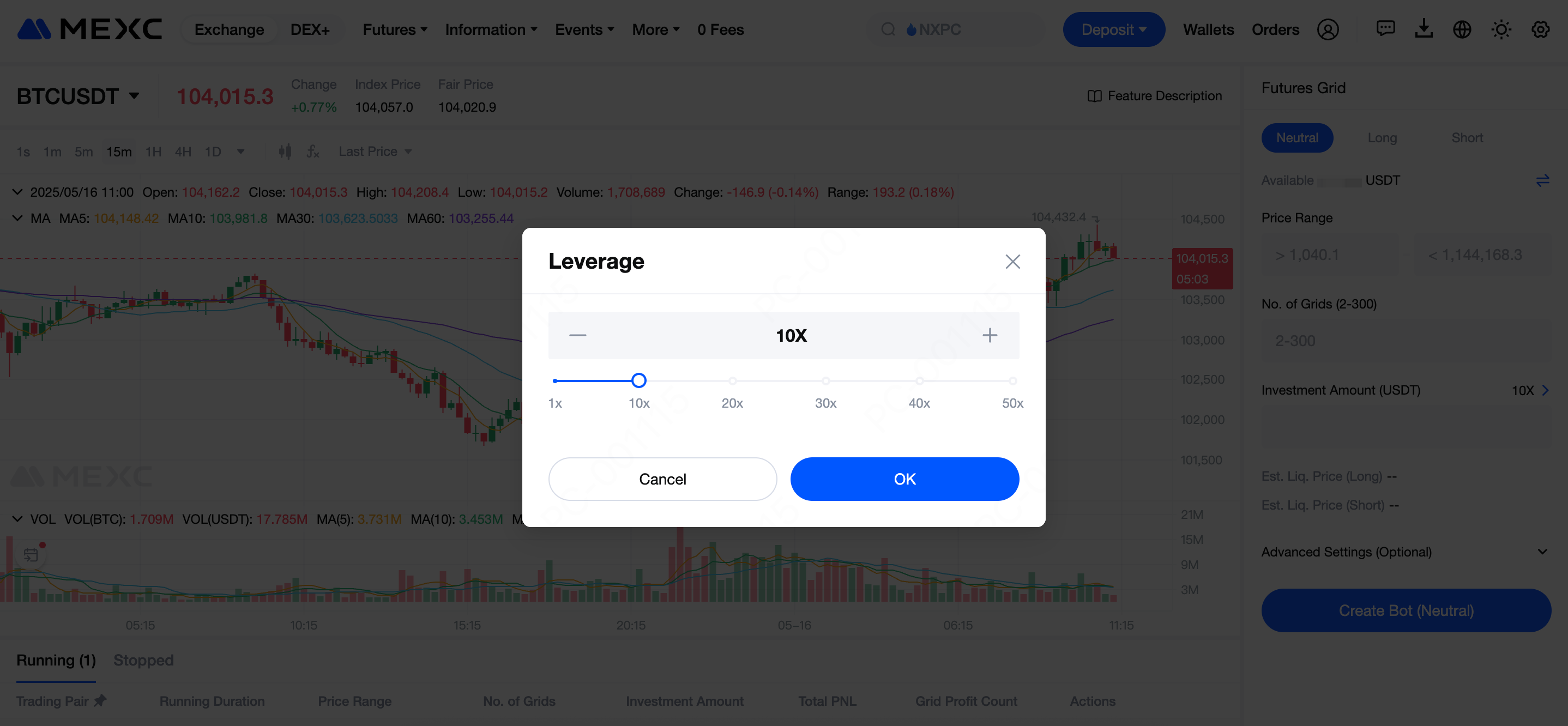 Leva finanziaria: seleziona un livello di leva finanziaria in base alla tua tolleranza al rischio. Il trading grid futures di MEXC supporta attualmente una leva finanziaria da 1x a 50x.