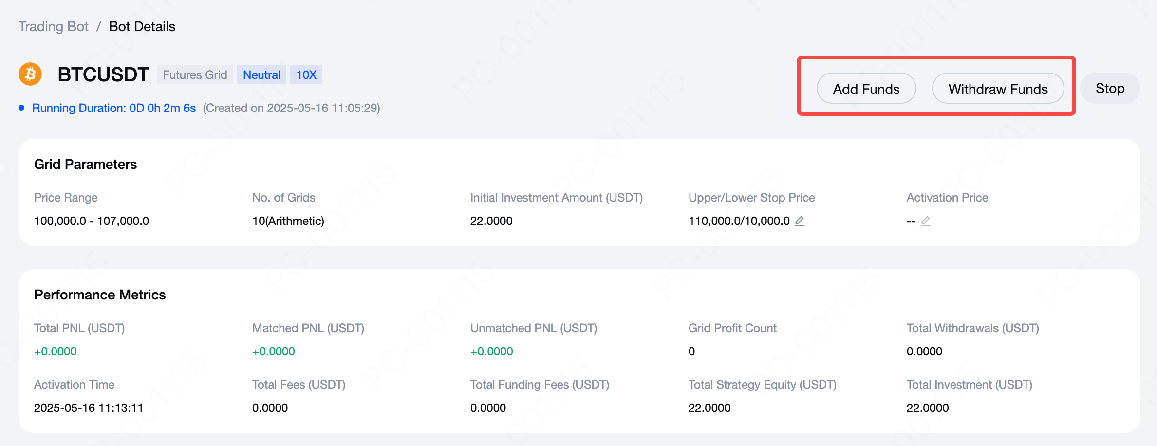 Mentre il bot è in esecuzione, puoi aggiungere o rimuovere fondi in qualsiasi momento. Clicca sul pulsante Dettagli nel pannello di trading per accedere alla pagina dei dettagli del bot.