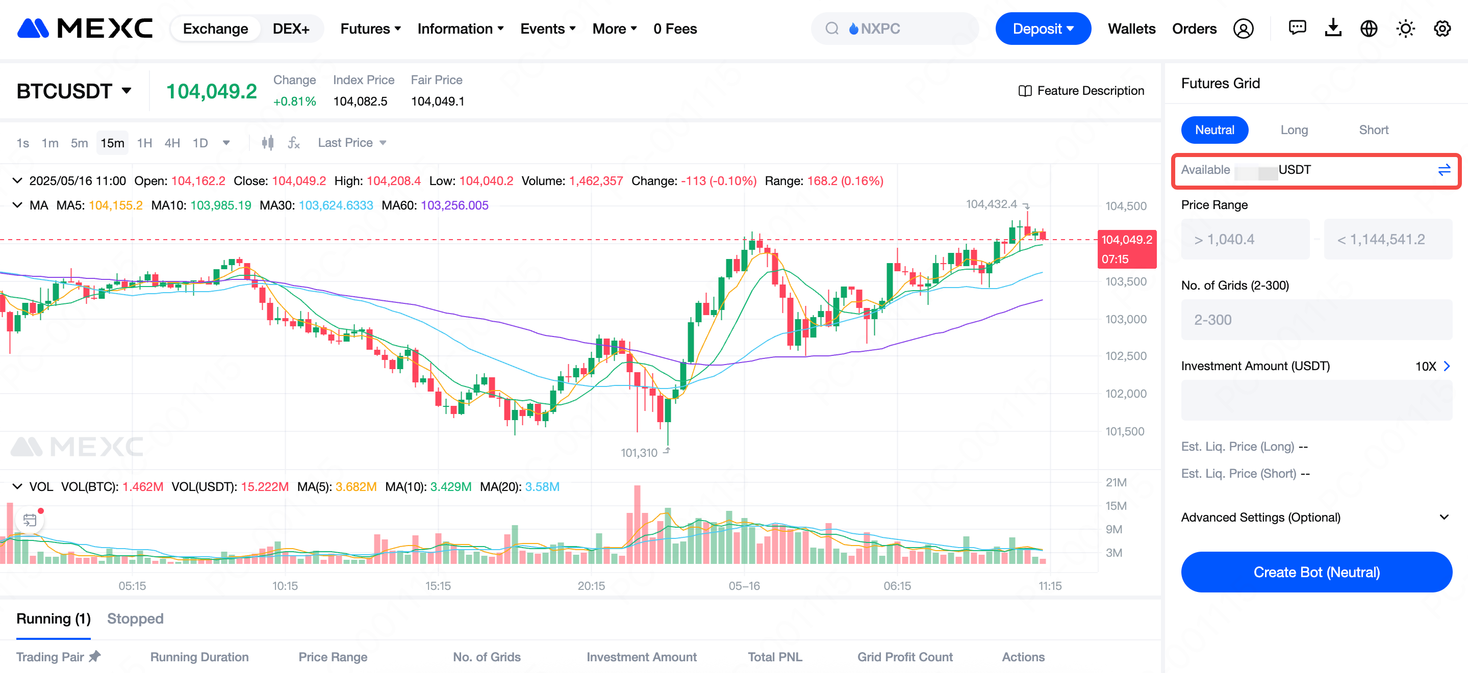Per impostazione predefinita, il bot per il grid trading utilizza i fondi trasferiti dal portafoglio spot dell'utente. Prima di iniziare a fare trading grid futures, assicurati che ci siano fondi sufficienti disponibili nel tuo portafoglio spot.