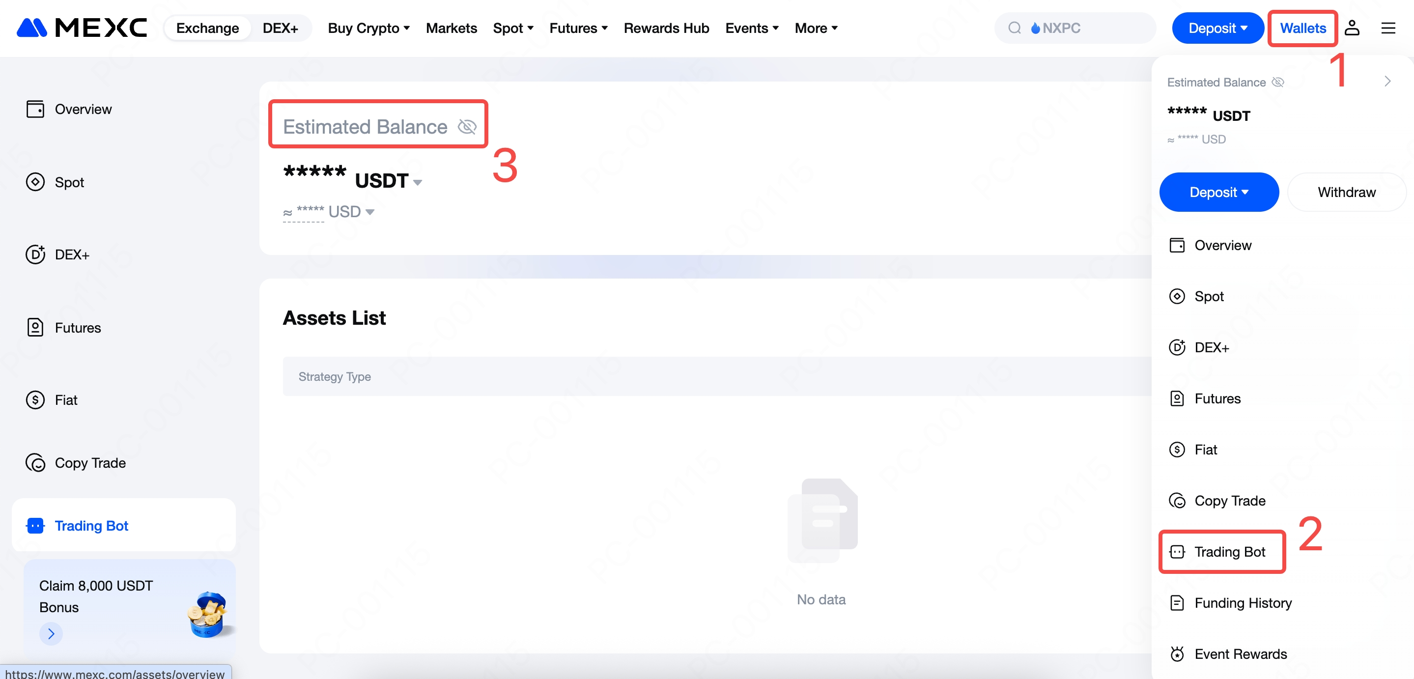 Nella homepage di MEXC, vai alla barra di navigazione in alto, passa il mouse su Portafoglio e seleziona Bot di trading per visualizzare i dati attuali degli asset del bot.