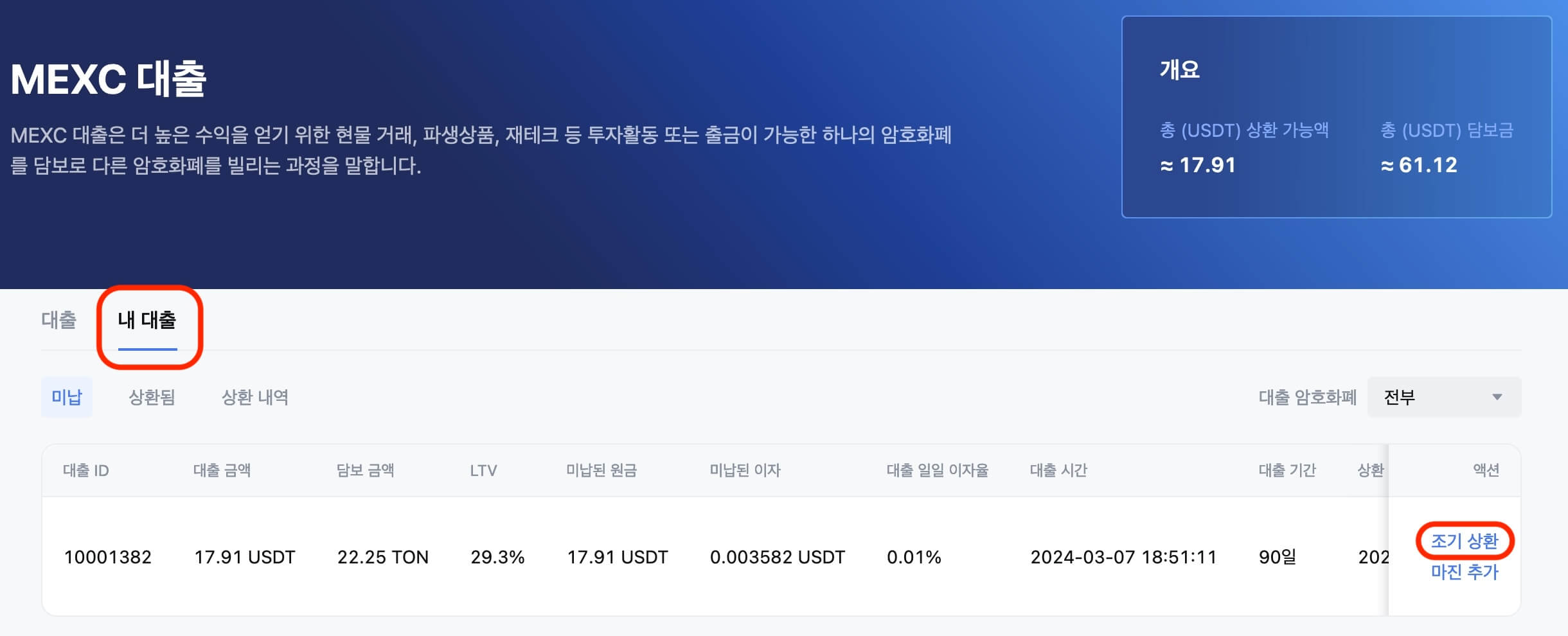 - 사전 상환 서비스가 활성화되면 자산을 빌린 사용자는 MEXC 대출 웹 포털을 방문하여 상환할 수 있습니다.