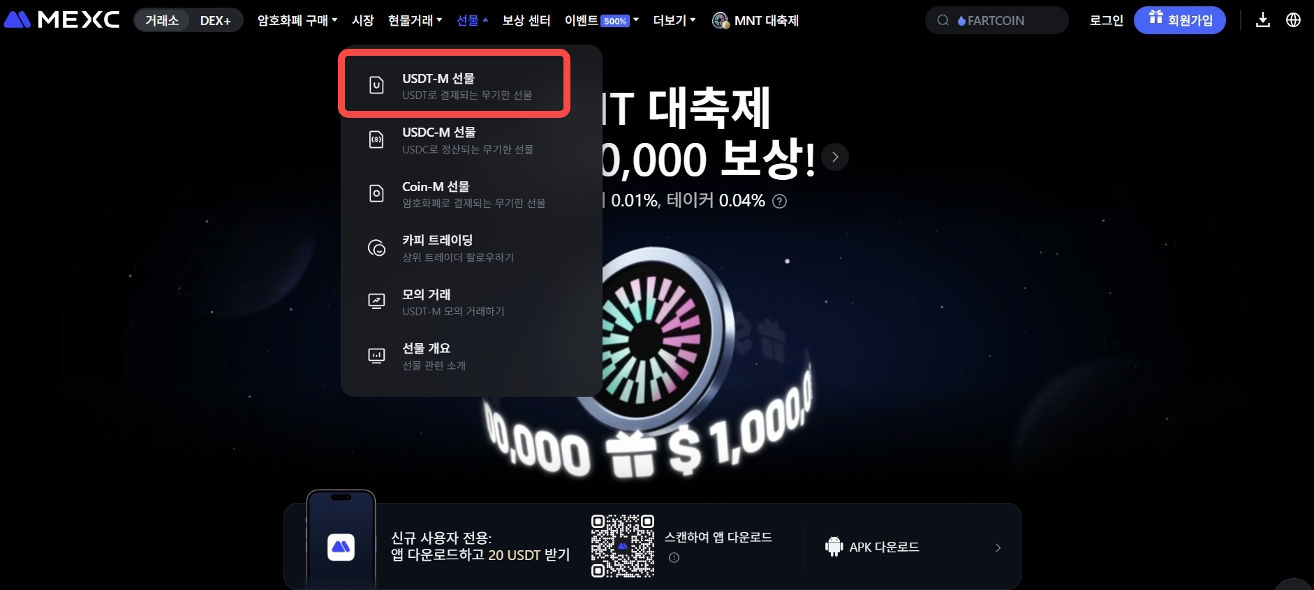 1단계: MEXC 홈페이지의 선물 탭에서 USDT-M 선물을 선택합니다.