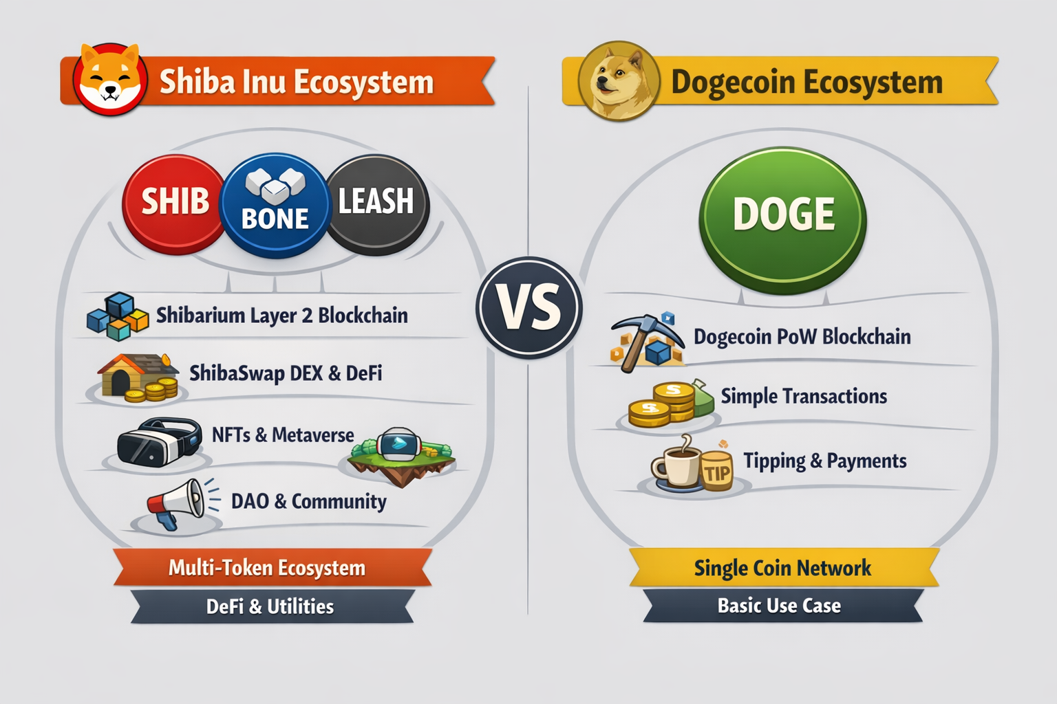 Answer: Shiba Inu’s ecosystem includes DeFi (ShibaSwap), Layer‑2 (Shibarium), and multiple tokens (BONE, LEASH), whereas Dogecoin remains primarily a digital currency with limited additional infrastructure.