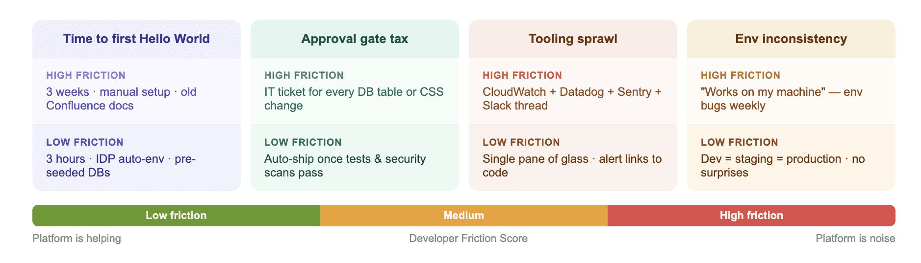 By actively measuring and driving down the Developer Friction Score, you aren’t just making your engineering team happier. You are drastically improving your time-to-market, reducing the devastating costs of developer burnout, and ensuring that the expensive platform you built is actually serving its intended purpose: helping your team ship brilliant products, faster.
