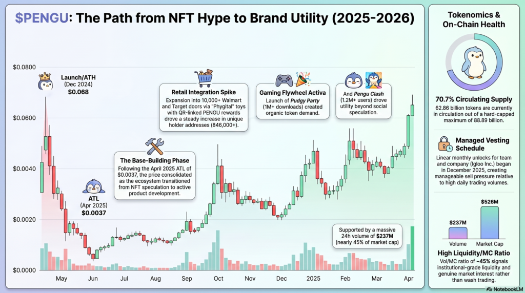 For crypto investors and analysts tired of pure meme-coin volatility, $PENGU offers a rare case study: a Solana-based token launched in December 2024 that ties its value directly to a maturing consumer IP brand. This is not another anonymous pump. It is a community-aligned asset backed by 10,000+ retail doors (Walmart, Target), million-download games, and an active operator scaling “crypto rails” into mainstream culture. Below is a comprehensive, numbers-first analysis of the token itself—supply structure, utility mechanics, on-chain health, performance drivers, risks, and forward-looking implications.