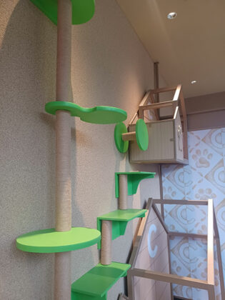 There is also a playpen that can also serve as a photowall for cats. It contains a mini house, tiered ledges, and scratch poles for them to explore and let off steam.