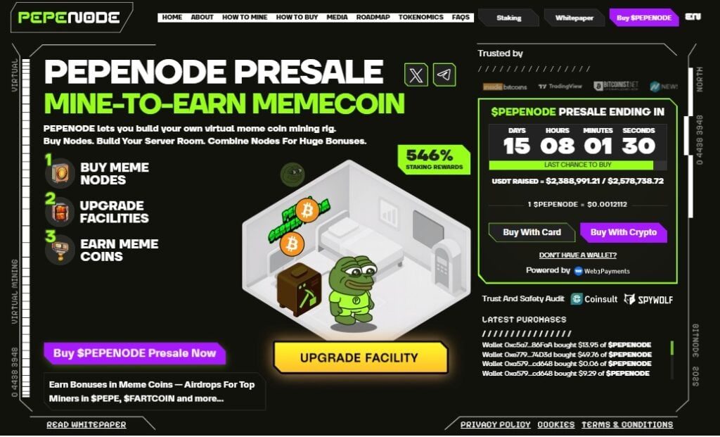 The platform gamifies the mining process, allowing users to strategically combine and upgrade nodes to maximize yield and compete on leaderboards. With only $2.3 million raised so far, Pepenode has just 15 days remaining before the presale concludes.