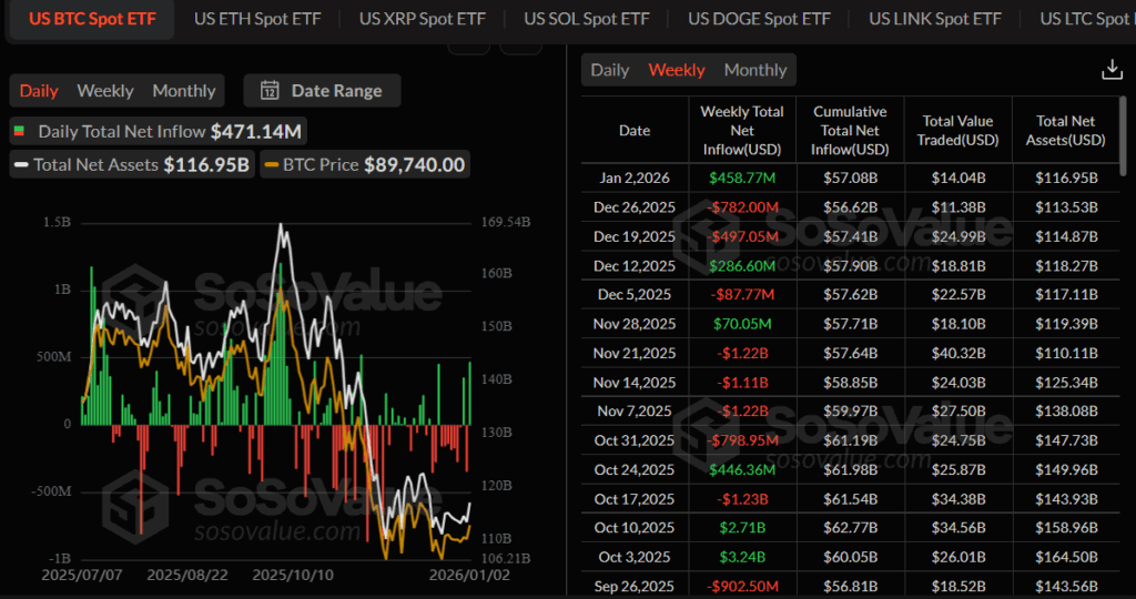 With that, Bitcoin ETFs, which have been in a record decline in the last two months, where there have been no inflows, last week, posted around $458.77 million total inflow. As per SoSoValue data, last Friday, Jan 02nd, BTC ETFs saw $471.14 million, which brings the cumulative total net inflow to approximately $57.08 billion.