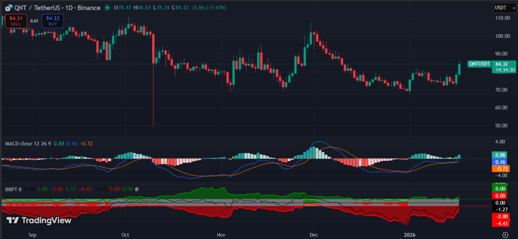Quant (QNT) has shown a notable recovery in recent trading sessions, with the price currently hovering around $84.40. After a period of sideways consolidation near the $70–$75 range, QNT has broken above its short-term resistance, signaling renewed bullish momentum.