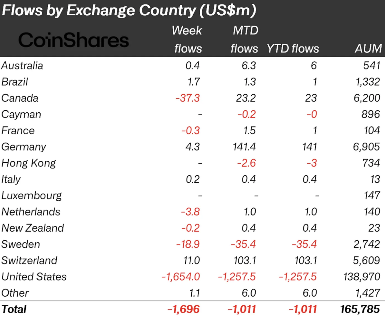 Outflows during the week were overwhelmingly concentrated in the United States, which accounted for $1.65 billionof the total redemptions. Negative sentiment was also evident in other major markets, including Canada, which recorded $37.3 million in outflows, and Sweden, which saw $18.9 million exit digital asset products.