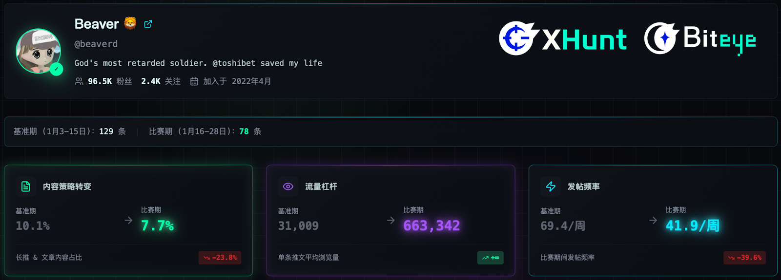 Many people are confused as to why his phenomenal article, "How to Fix Your Entire Life," which garnered 170 million views and spurred the Alpha launch of the MEME coin "1," didn't win an award. The answer is simple: timing was wrong. The article was published on January 12th, while the competition didn't start until January 16th. This also perfectly explains why his traffic during the competition period appeared to "plummet" by 90% in XHunt data—because the baseline data was inflated too much by that viral article.