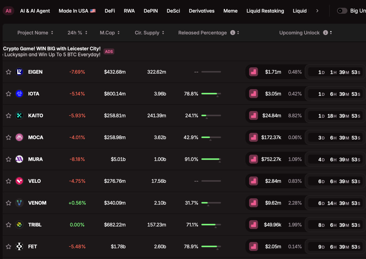 The first wave of events includes EIGEN and IOTA, both scheduled within the next 48 hours. EIGEN, valued at $432.6 million with 322.6 million tokens circulating, will see a $1.71 million unlock representing 0.48% of supply. IOTA, with nearly 79% already unlocked, faces a $3.05 million release, but its $800 million market cap should help cushion the impact. These are manageable compared to what lies ahead for lower-circulation names.