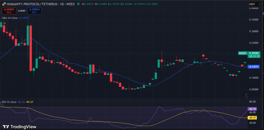 Technically, Humanity Protocol’s 14-day Simple Moving Average (SMA) has turned upward, with price trading comfortably above it near $0.147, confirming the short-term bullish bias. Momentum indicators further support the move. The Relative Strength Index (RSI) has surged to 66.5, approaching overbought territory but still leaving room for upside continuation.