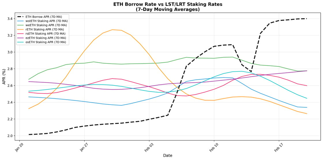 Borrow rates rose from approximately 2.0% to over 3.4% by mid-February. During that same period, staking and restaking yields (represented by colored lines) remained flat or slightly declined.