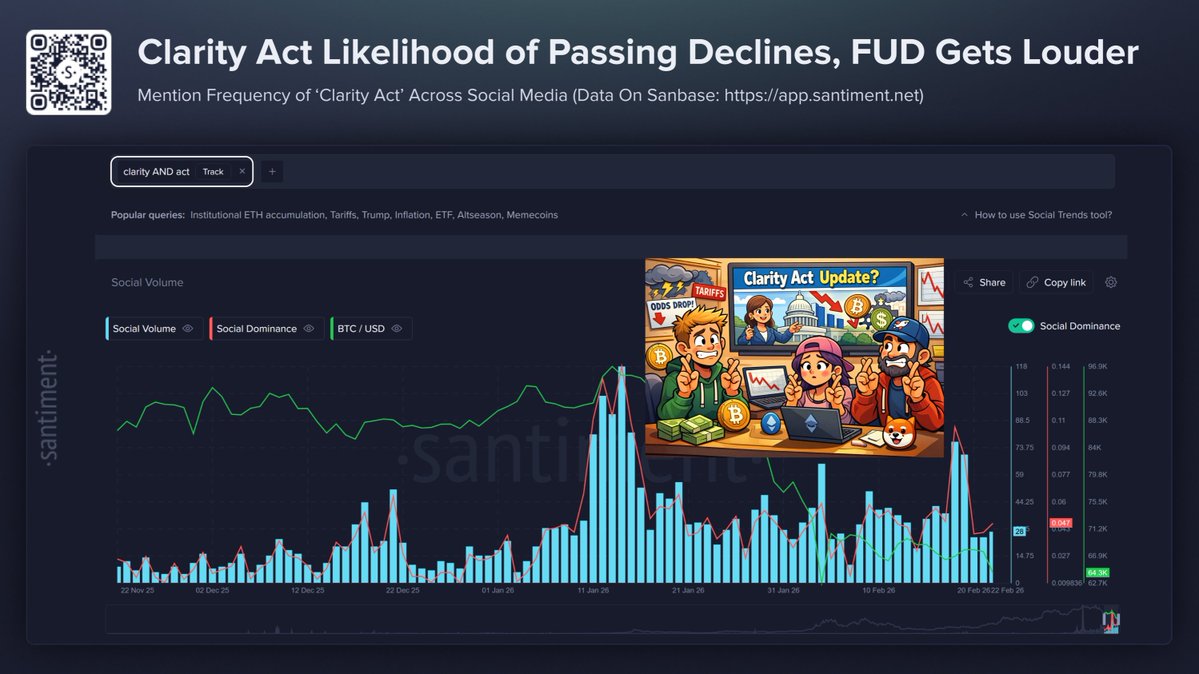 Santiment notes that a lower probability of passage may trigger additional fear-driven commentary across social platforms. However, prediction market odds represent expectations, not confirmed outcomes.