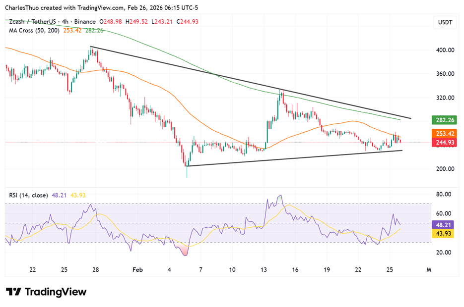 On the charts, ZEC is trading within a descending triangle on the 4-hour timeframe, and it recently broke a key trendline below, signalling some bearish momentum in the near term.