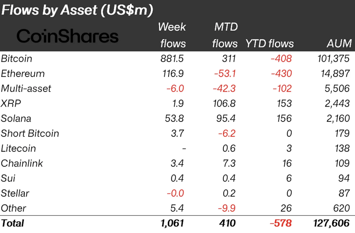 CoinShares data shows digital asset investment products recorded $1.06 billion in net inflows last week, snapping five consecutive weeks of outflows that totalled $4 billion, with Bitcoin taking $881 million of that total.