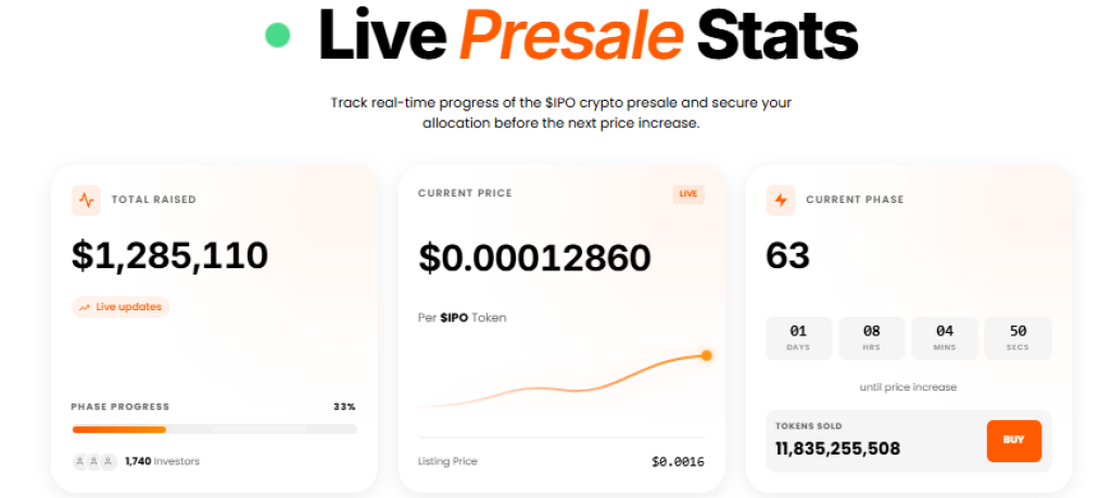 At the time of writing, the $IPO is priced at $0.00012860 per token. A $1,000 position gets about 7.78 million $IPO at the base presale price.