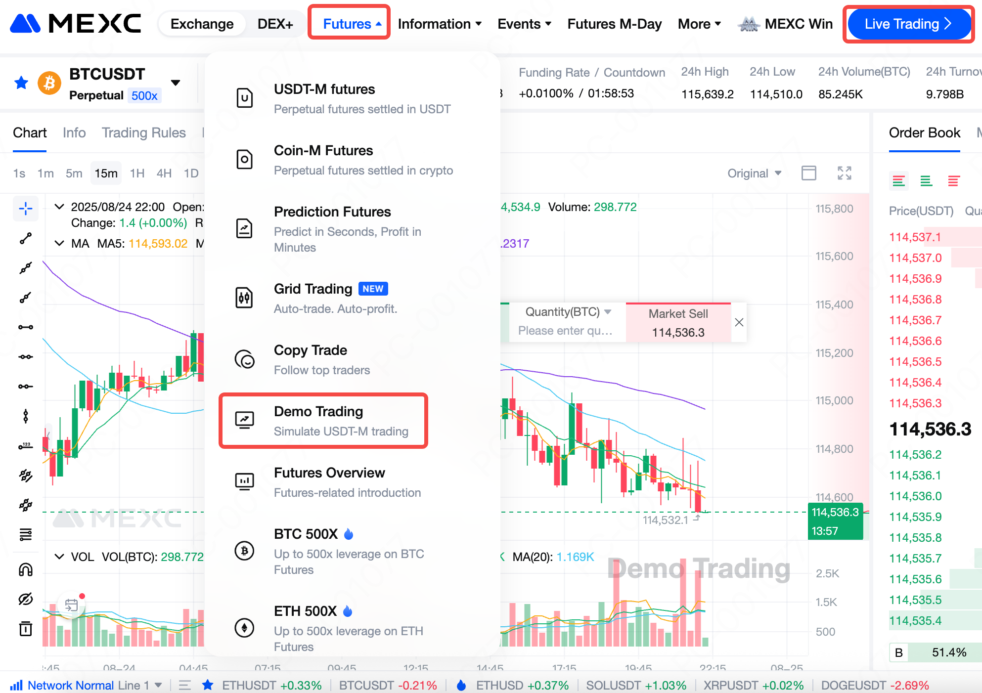 1) Valor de uma simulação realista: O simulador de negociação de Futuros da MEXC replica totalmente a interface, as funções e os dados de mercado da negociação ao vivo, cobrindo pares principais como BTCUSDT. Isso permite que os usuários pratiquem em um ambiente que espelha de perto os mercados reais, garantindo uma transferência perfeita de habilidades para a negociação real.
