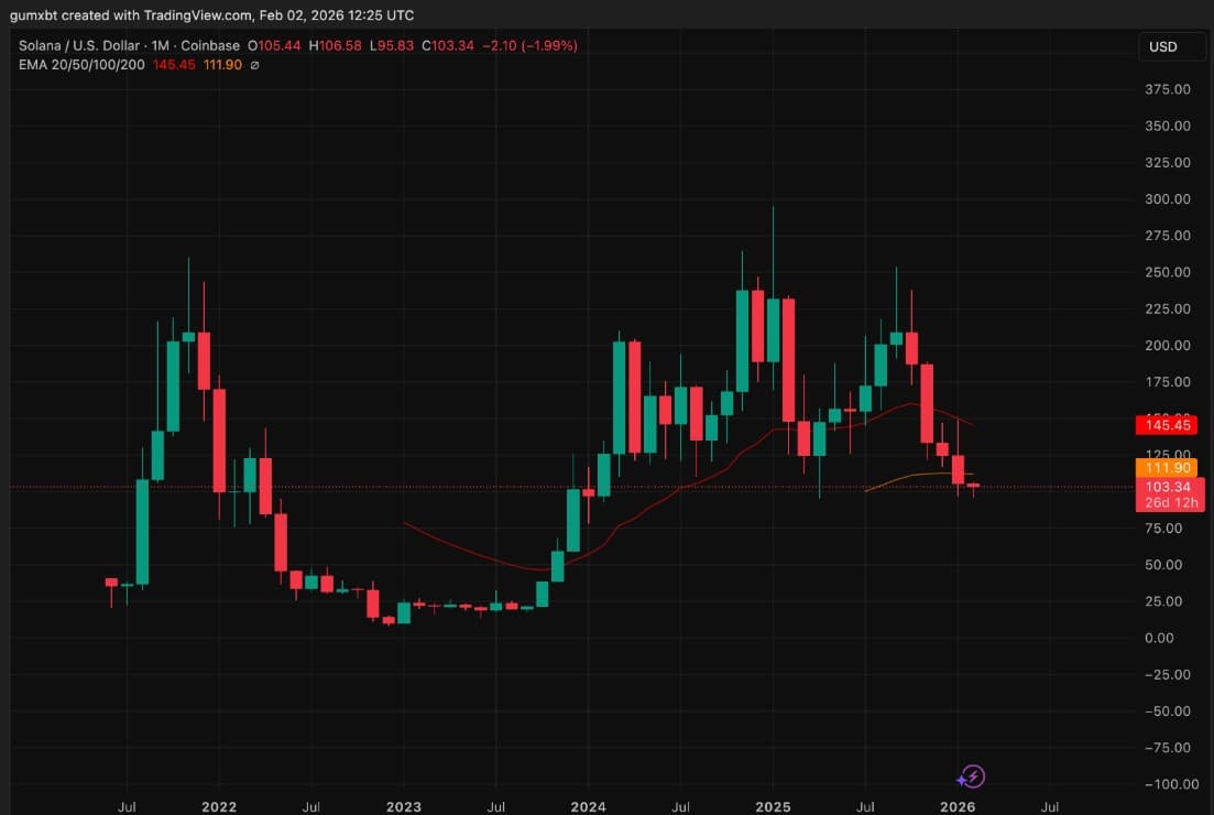 O analista Bitcoinsensus reforçou essa leitura em uma publicação no X, afirmando que a Solana “confirmou uma ruptura desse padrão macro“, o que abre espaço para um alvo mínimo entre US$ 50 e US$ 45.