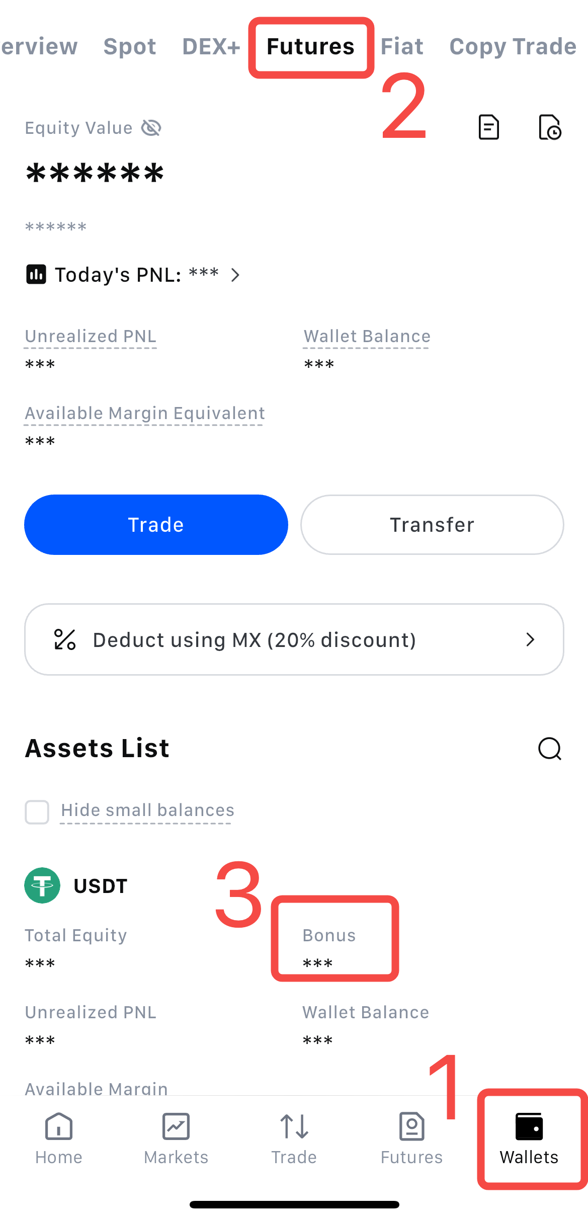 เปิดและเข้าสู่ระบบแอป MEXC ของคุณ บนแท็บกระเป๋าเงิน แตะ ฟิวเจอร์ส และภายใต้รายการสินทรัพย์ ด้านล่าง USDT คุณสามารถดูยอดคงเหลือโบนัสฟิวเจอร์สของคุณได้
