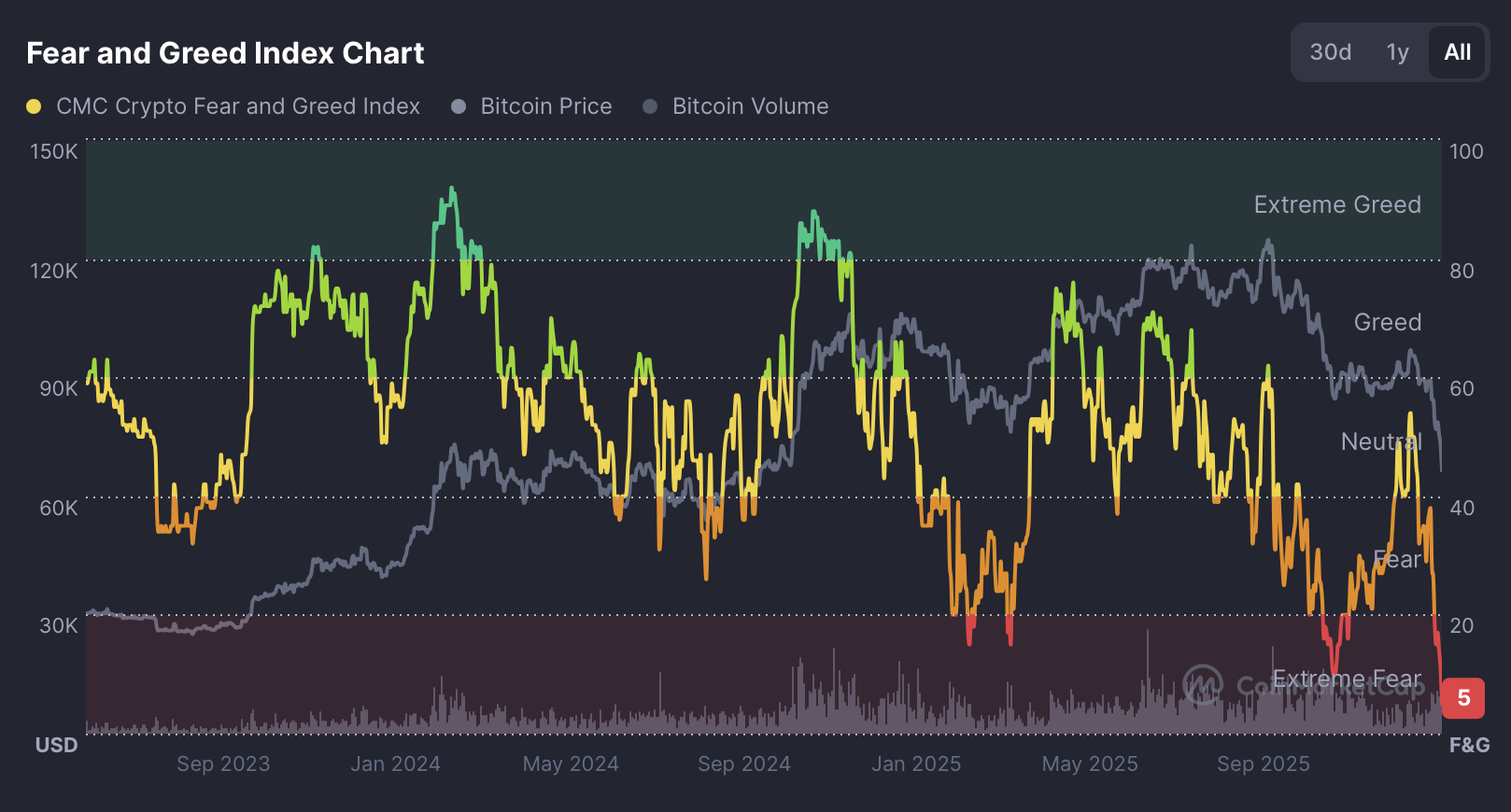 As the broader crypto market retraced, the Fear and Greed Index collapsed to 5, pushing decisively into extreme fear territory and marking its lowest reading sinceAs the broader crypto market retraced, the Fear and Greed Index collapsed to 5, pushing decisively into extreme fear territory and marking its lowest reading since