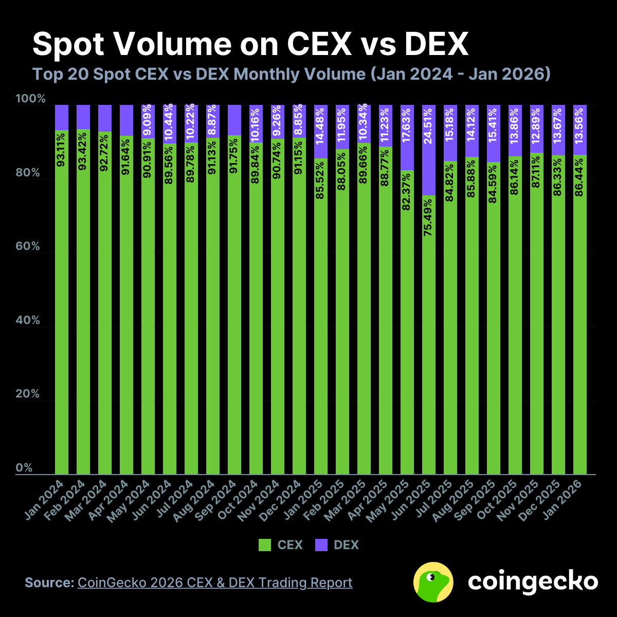 CoinGecko’s 2026 CEX and DEX Trading Report covering January 2025 through February 2026 shows DEX spot market share doubling from 6.9% to 13.6%, perp DEX volume growing 8x from $81.7 billion to $739.5 billion, and crypto exchanges recording over $2.4 billion in hack-related losses during the period.