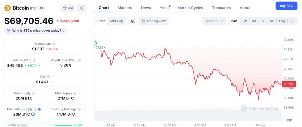BTC trades at $69,705 after the FOMC held rates at 3.50% to 3.75% and signaled only one cut for 2026 according to CoinMarketCap.