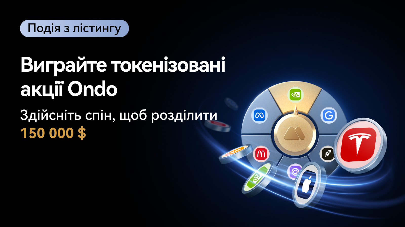 Для початку ми запускаємо ексклюзивну подію Колесо фортуни Ondo Global Markets. Виконуйте прості завдання, здійснюйте спін і вигравайте свою частку зі 150 000 $ в токенізованих акціях!