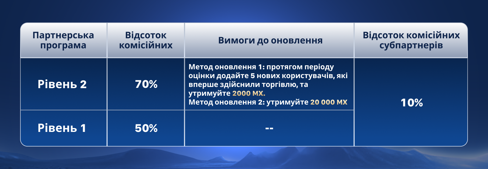 Якщо умови підвищення будуть виконані протягом поточного циклу, ваш рівень комісійних буде автоматично підвищено до рівня 2 у наступному циклі. Якщо умови не будуть виконані, ваш рівень комісійних повернеться до рівня 1.