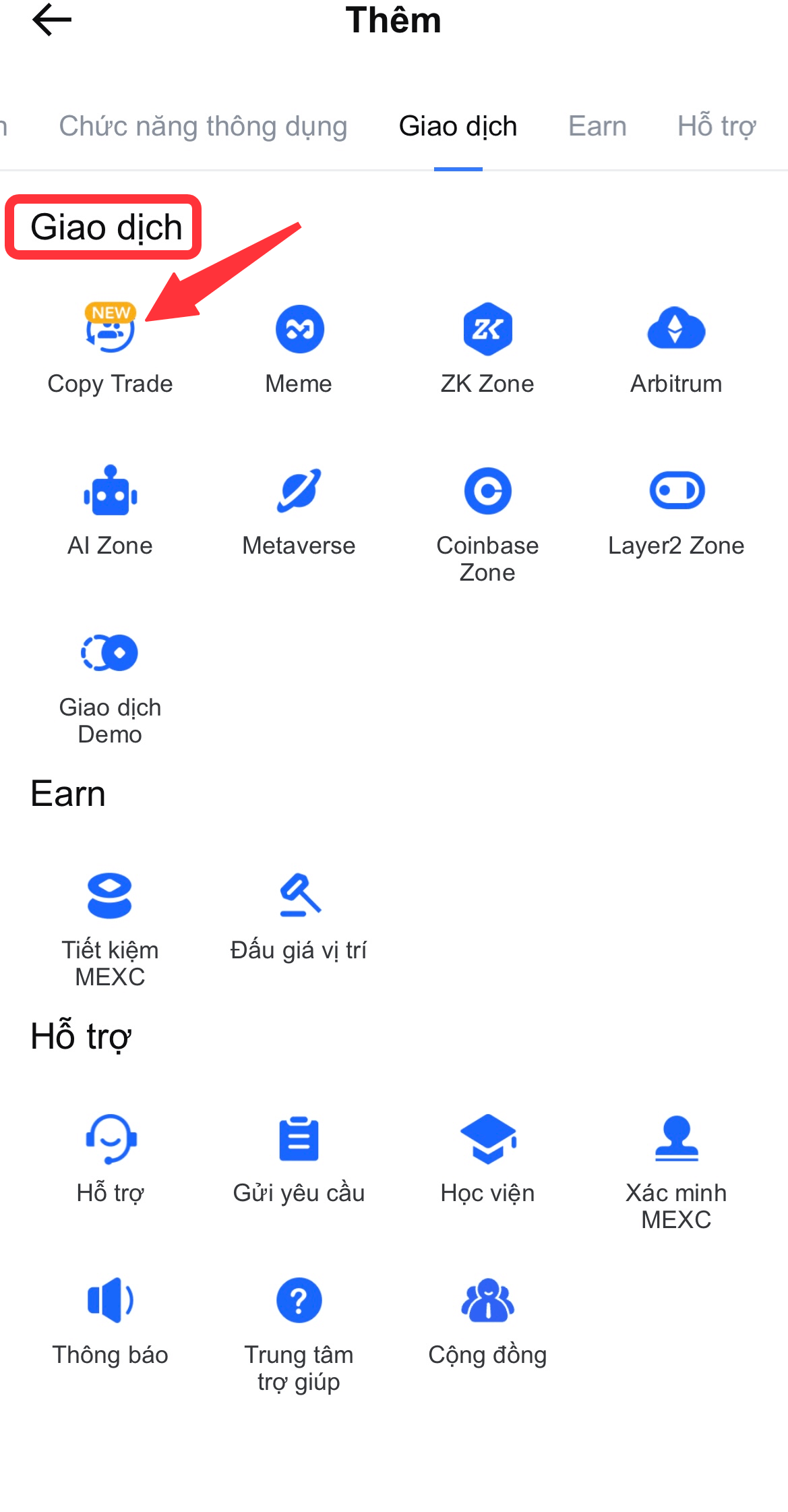Vị trí Copy Trade:APP> Thêm > Giao dịch > Copy Trade
