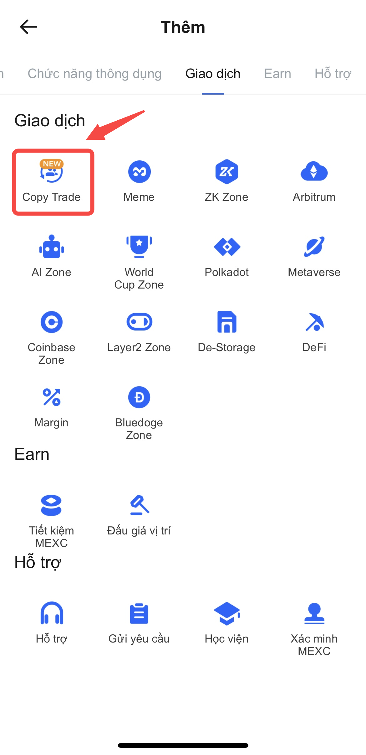 Vị trí truy cập Copy Trade:APP>Thêm> Giao dịch> Copy Trade
