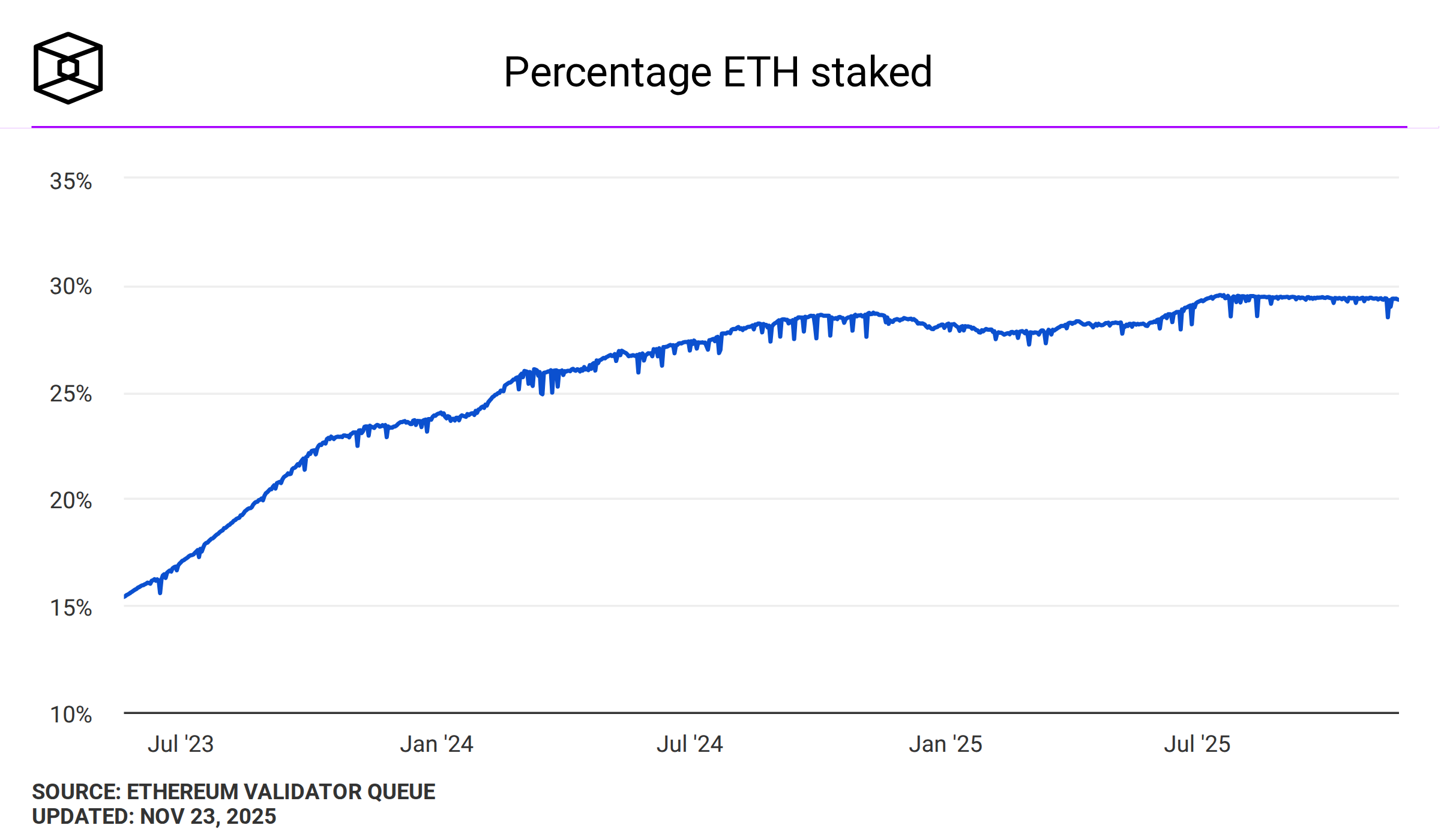 Staking ETH là một trong những xu hướng mang tính cấu trúc mạnh nhất. Khoảng 30% tổng cung ETH đang được stake (tăng từ ~15% cách đây hai năm), và đường cong tăng trưởng hầu như không hề giảm. Các token staking thanh khoản chiếm hơn 14.12 triệu ETH, và phần thưởng duy trì ổn định ở mức 2.5-4%.