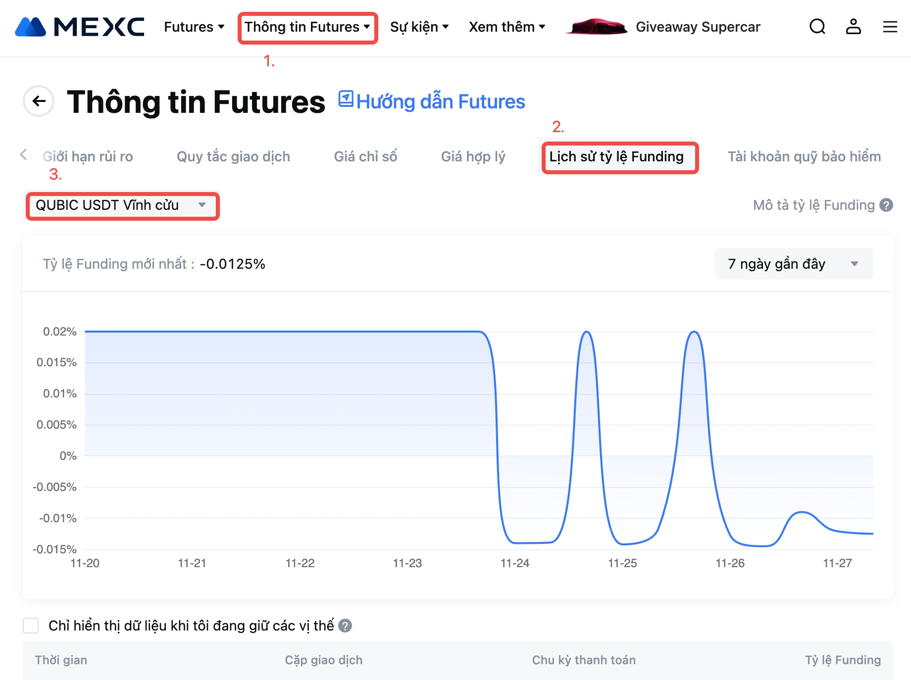 Để biết chi tiết tỷ lệ Funding mới nhất, vui lòng tham khảo Thông tin Futures - Lịch sử tỷ lệ Funding.