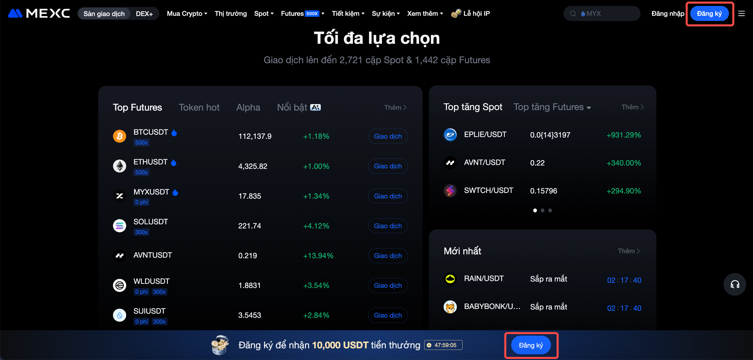 Mở trang web chính thức của MEXC và nhấn nút Đăng ký.