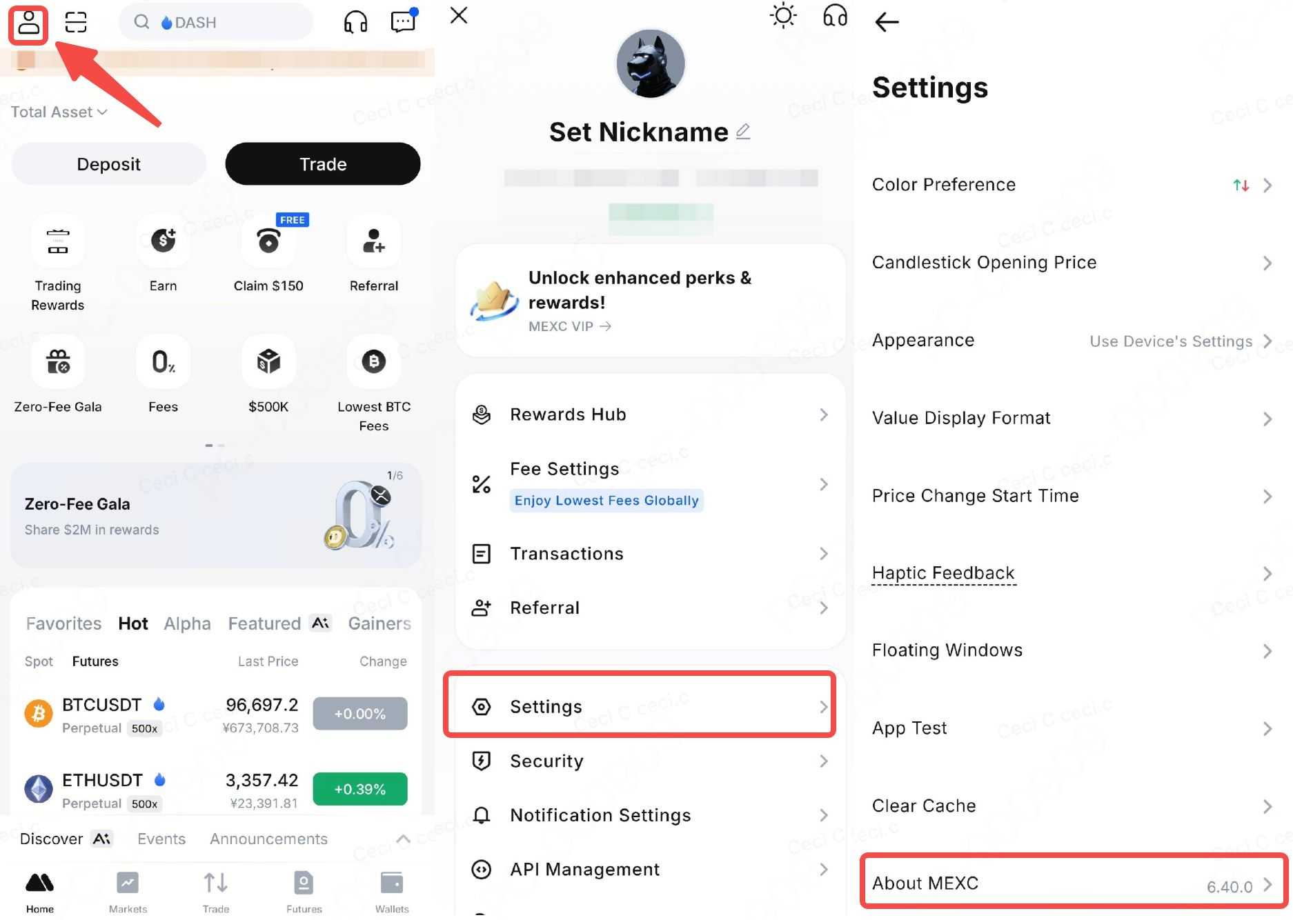 Nếu bạn gặp vấn đề này, vui lòng mở lần lượt cả hai App MEXC trên màn hình chính, nhấn vào biểu tượng người dùng, truy cập Cài đặt, cuộn xuống cuối trang và nhấn vào Về chúng tôi để kiểm tra số phiên bản như hình bên dưới. Vui lòng giữ lại App MEXC có số phiên bản cao hơn và gỡ cài đặt App có số phiên bản thấp hơn.
