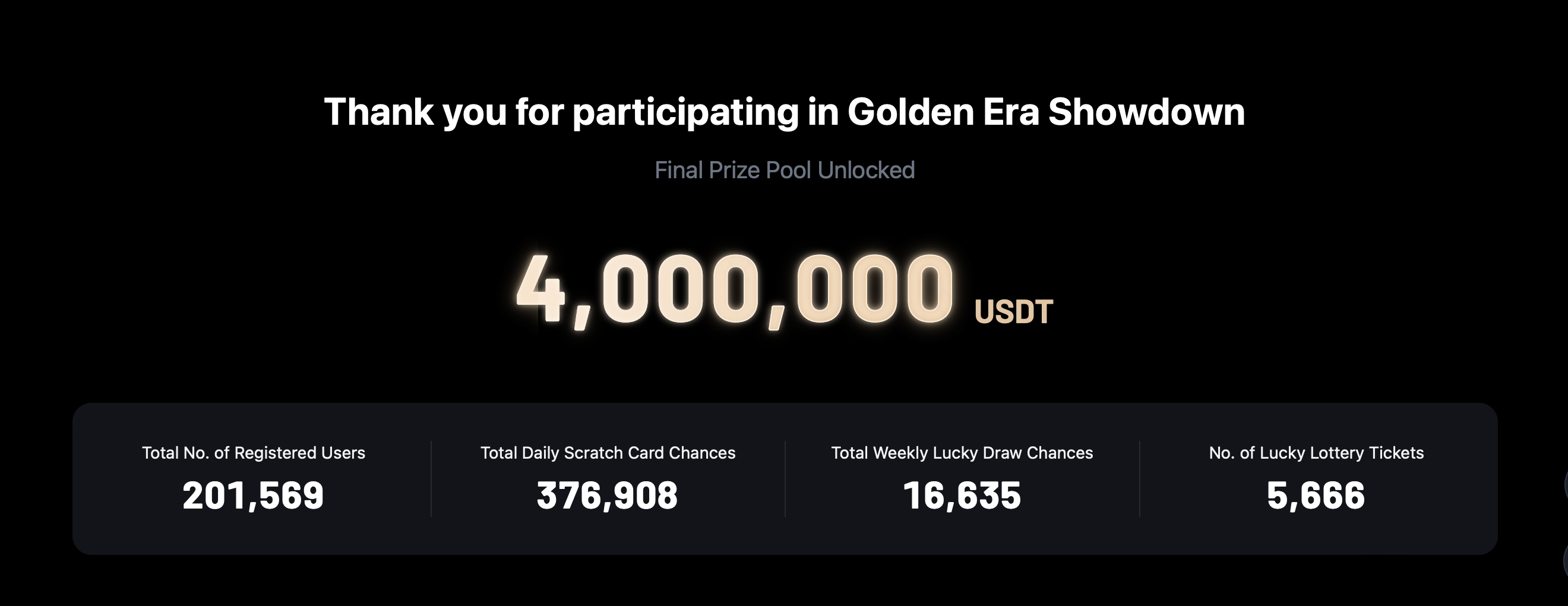 感谢您让黄金时代对决成为一场难忘的盛事!经过激烈且充满期待的竞赛,总计有 201,569 名参与者,共释出高达 4,000,000 USDT 的奖池。现在,让我们揭晓赢得最高荣誉的冠军们!